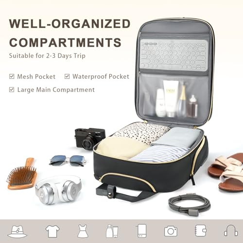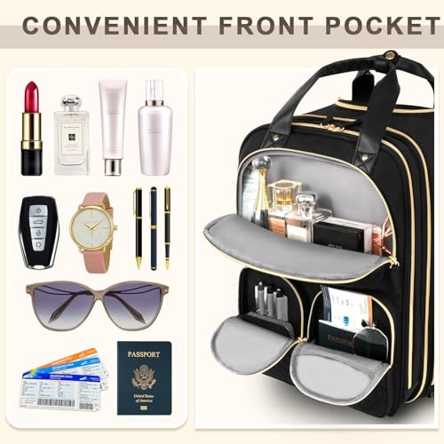 Return Policy Fast Delivery Trusted seller Underseat Carry On Luggage with Wheels, Multiple Compartments Airline Approved Personal Item Bag, Travel Carry-On with Leather Handle, Lightweight Rolling Suitcase for Women, Black Gold, L Product Description Airline Approved: Carry on luggage with wheels measures 17.4" H x 13.2" L x 7.5" W (including the height of the wheels), meeting approved airline carry on luggage dimensions. It easily fits into overhead bin and under the seat. This underseat carry on luggage with wheels complies with major airlines' published carry-on luggage and personal item size requirements, including Delta Airline; Southwest Airline; Spirit Airline, etc Hassle-Free Travel: The 180° opening design meets TSA standard, allowing for quick inspection and convenient boarding. Thanks to the smooth rollers, it effortlessly passes through the airport with a full underseat carry on luggage. Additionally, the luggage strap at the back allow the underseat luggage to be secured to larger suitcases Multifunctional Compartments: The main compartment provides ample space for all your travel essentials and clothing. It also includes a waterproof pocket to protect your toiletries from leaks and spills. Additionally, t's a foam-padded compartment that can safeguard two laptops up to 18 inches in size simultaneously. Three front zippered pockets offer convenient access to frequently used items, keeping everything organized and easily reachable Secure Design: Constructed from premium high density polyester, our underseat suitcase provides reliable protection against spills and cuts, keeping your belongings safe and dry. The foam-padded laptop compartment protects your laptop from impacts. The double zipper design with lock hole allows you to lock it for theft prevention Sturdy and Ergonomic: Featuring an all-aluminum trolley handle for easy pulling, this underseat rolling bag is ergonomically designed for the comfort of frequent travelers. The soft handle relieves hand fatigue, ensuring a comfortable grip throughout your journey Shipping Returns Payment Shipping Shipping is FREE to all addresses other than APO/PO boxes in the lower 48 states. All our stock ships from US-based warehouses. Shipped via USPS or UPS (depending on location and package weight) Unless stated otherwise, all orders will ship within 24-72 hours of your payment being processed. Check our feedback to see the great reviews of FAST shipping we offer. Returns Seller does not accept returns Payment We currently accept payment via eBay managed payments only. Once payment is cleared, we will dispatch your shipment within 1-3 business days. Please refer to the "Shipping" tab for more information regarding shipping speed to your destination.