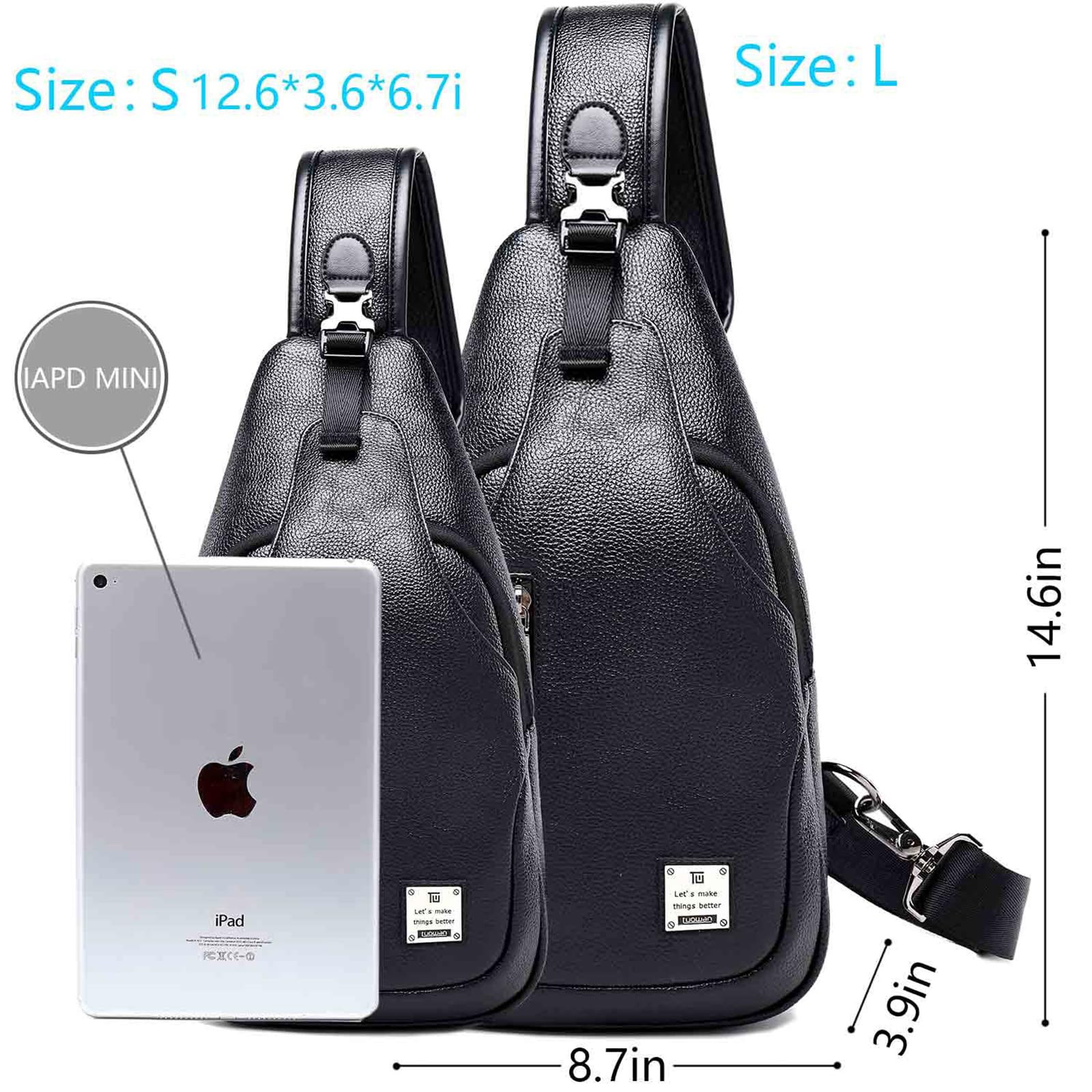 Durable and lightweight sling bag for men women: made of waterproof PU Leather ( similar to real leather), high-grade polyester lining and smooth Zipper. Precise Seam and Reinforced Bartack process make this leather sling backpack more durable and sturdy Multiple storage purpose crossbody bag for men women: 1 front pocket with a safe button and 2 large zippered compartments with small inner pouches to safely and organize your kindle, IPAD mini, camera, small tablet, passport, purse, keys, small snacks, MP3, power bank, notebook, water bottle, or so on. 2 small zippered pockets (1 front one and 1 back one) can hold things such as , business cards, cash and change... Comfortable and fashion over the shoulder bag: Adjustable, breathable and padded air mesh strap provide a more comfortable carry. Fashion, easy to use, practical design brings you more fashion sense and happiness to carry it all the time Casual daypack: Perfectly works as shoulder bag, chest pack, crossbody backpack, travel bag, business bag, multi-purpose bag, sling purse, personal pocket bag, outdoor sports bag ( hiking, camping, climbing, running, cycling,walking, etc) A must travel & everyday sling bag for you: Fashion, large storage capabilities and a compact, lightweight body.This sling shoulder backpack is a good size to carry your primary items and make them very organized. Variety of colors to choose