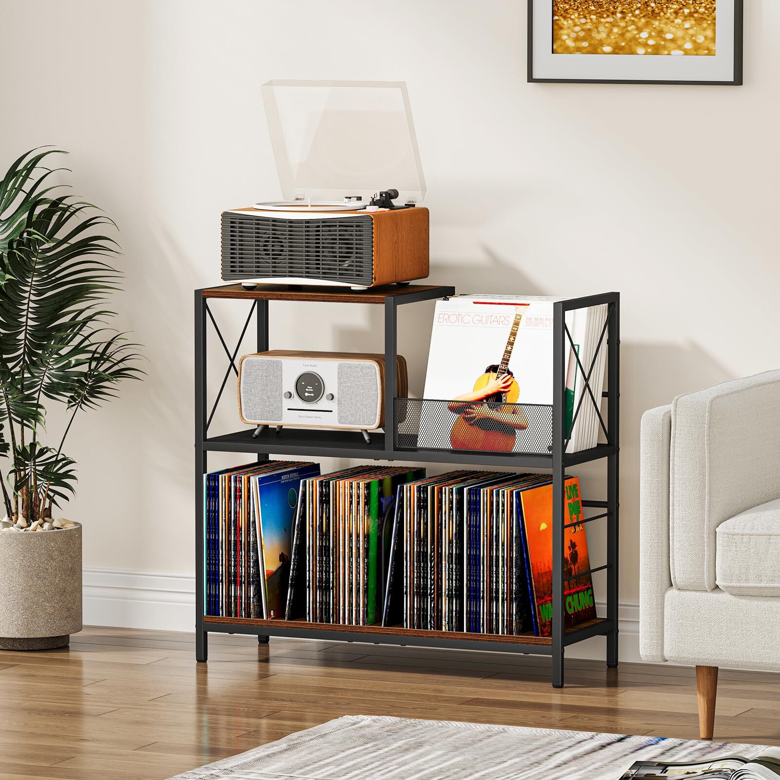 MULTIPLE SCENE APPLICATION: This vintage record player stand is perfect for living rooms, studies, bedrooms, and more. It can also function as a side table, bookshelf, or storage rack. In addition to holding vinyl records, it can a variety of household items. LARGER STORAGE SPACE: This record player stand can hold up to 300 vinyl records. The bottom section is designed for record storage, while the top and middle sections can accommodate speakers, audio equipment, and other small items. The three-tier design helps to better organize your vinyl collection and media essentials while also providing a spot for your record player. It's a perfect fit for any space in your home or office. DURABLE AND STURDY: The record stand is made from high-quality particleboard, featuring eco-friendly and waterproof properties. Supported by robust iron pipes, it ensures long-lasting durability and resistance to deformation. With its vintage brown color, it combines rustic elements with modern design, making it suitable for various home decor styles. PRODUCT DIMENSIONS: 31.1 inches (L) x 11.81 inches (W) x 29.53 inches (H). The upper tier displays the front covers of your records for easy viewing and retrieval. The lower tier includes three metal dividers for organized categorization of your vinyl collection, making it the perfect choice for your needs. EASY TO ASSEMBLE: This vinyl record stand comes with detailed assembly instructions. Each part is clearly numbered, making it easy for you to the manual and assemble it effortlessly. If you encounter any issues during installation or use, please feel free to us. We are here to provide you with support and solutions.