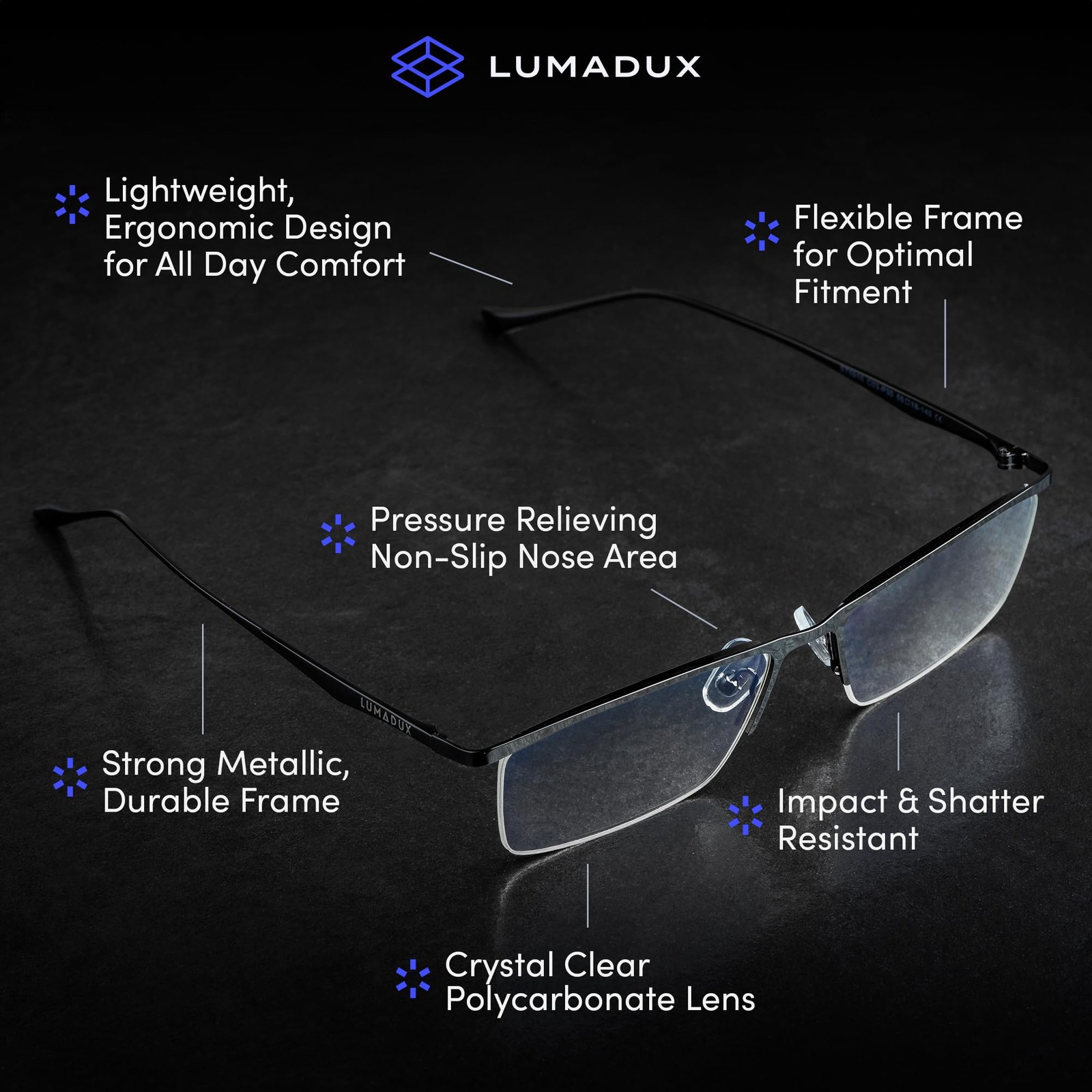 Blue Light Blocking Reading Glasses offer Superior Eye Protection and Stylish Comfort Discover the ultimate solution for digital eye strain with Blue Light Blocking Reading Glasses. Designed to protect your eyes and enhance your visual experience, our glasses combine cutting-edge technology with sleek, fashionable designs. Whether you're spending hours in front of a computer, reading, or gaming, glasses provide optimal protection and comfort. Featuring a versatile unisex design, these glasses suit both men and women, blending effortlessly with any outfit. Our glasses are available in various prescriptions, ensuring clear vision for all users. The lightweight frames make them perfect for all-day wear, offering both style and comfort. Use them as prescription reading glasses, gaming glasses, or computer glasses to keep your eyes comfortable during extended screen time. EYE STRAIN, DIGITAL HEADACHES & MIGRAINES - Prolonged screen exposure may create stress on your optic nerves. glasses are designed to alleviate tension and give you crystal clear clarity with protection from today’s overwhelming screen blue light. CRAFTED FOR COMFORT & ALL DAY USE - Working from home, gaming, or long hours in front of a digital computer screen just got easier. Our glasses are perfectly balanced - lightweight & ergonomically designed so you can be productive and at the top of your game while looking stylish. PREMIUM MATERIALS WITHOUT GOING TO THE OPTOMETRIST - Skip the expensive doctor’s appointments with inflated, overpriced eyeglasses. Our anti-glare polycarbonate, impact, and scratch-resistant lenses filter out harmful blue light and are coupled with flexible, metallic rimless frames built for strong durability & proper fitment. LIFE CHANGING EXPERIENCE - Our customers rave about less eye pressure & strain, better, quality sleep, more efficiency, and reduction of sensitivity while using digital devices like laptops, phones, tablets, television, and more. OUR RISK-FREE GUARANTEE - we know your vision is unique, just like you, so we want you to feel confident in your purchase. If you’re not completely satisfied with the results or fitment, simply reach out to us and we’ll get you sorted with a solution.