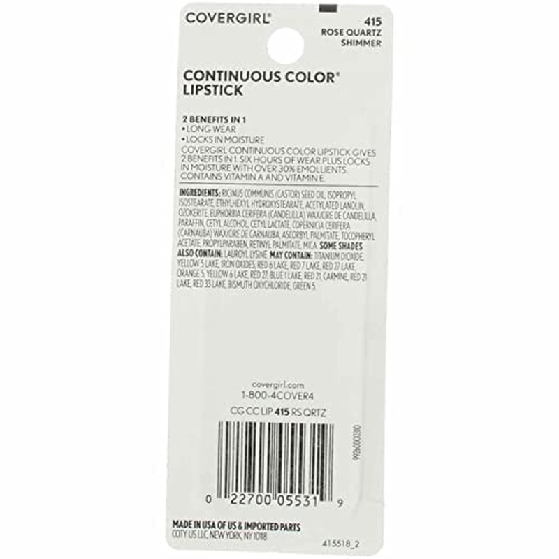 Store New Arrivals Add to Favorite View Feedback Continuous Color Lipstick Rose Quartz 415, .13 Oz (Packaging May Vary) Description Item model number 00022700055319 Color Rose Quartz 415 Finish Type Shimmery Product Dimensions 1.85 x 0.85 x 4.8 inches; 0.13 ounces Product Benefits Moisturizing Is Discontinued By Manufacturer No Item Form Balm Size 1 Count (Pack of 1) Locks in moisture Contains Vitamin A Contains Vitamin E Six hours of lasting color plus moisture Product Description COVERGIRL Continuous Color Lipstick gives 2 benefits in 1. Six hours of wear plus locks in moisture with over 30% emollients. Contains Vitamin A and Vitamin E. Brand Story By CoverGirl From the Manufacturer The moisture-rich formula and expanded palette of shades help keep lips soft and colorfully protected. For over fifty years, COVERGIRL has created must-have beauty products that bring out the best in women. We understand the transformative effect makeup can have not just on the outside, but the inside as well. Since 1961, COVERGIRL has made it easy, breezy, and beautiful to be yourself. Moisture-rich formula Contains Vitamins E and A Lasting color Tones that Set the Tone Subtle colors and neutral tones can serve you well on casual days and weekend afternoons. When it comes to dressing up and going to town, nothing says "Party!" better than a glamorous red! Complete the Look COVERGIRL LipPerfection Lipliner Transform your lip look with moisture-rich definition. Cheekers Blush Get sheer, natural looking color. LashBlast Volume Mascara Our best-selling mascara! Get Those Lips Into Shape Size 'em up, size 'em down—create the lips you've always wanted! Here are a few simple tricks and handy how-tos that can help you make the most of your beautiful smile. To Make Lips Look Fuller Pick a lipstick and lipliner in matching shades—choose lighter colors, since darker tones can make lips appear smaller. Use your lip pencil to define lips. Go to the outermost edge of lips but no further—do not go outside the natural lip line. Then fill in entire area with lipliner. This will "hold" lipstick longer. Apply your lipstick over lipliner. To Make Lips Look Wider Instead of plumping up thin lips, try accentuating your mouth's wonderful width! Use a liner that perfectly matches your lipstick and line the extreme edges of lips, extending out to corners. Fill in with lipstick color, then top with gloss on middle of lips only. To Make Lips Look Thinner Trace inside the natural lip line, and fill in with your lipstick. Picking a matte shade will also make lips appear smaller. To Add Natural Definition Give your lips a strong line using a neutral colored pencil, then fill in with a sheer gloss blended gently to the edges by a few strokes of the lip brush. The result is naturally shimmery and moist-looking lips. Customize Your Kiss Shiny, shimmery, sheer! We’ve got so many lipcolors for you to pucker up to. Outlast Lipstain Outlast All-Day Lipcolor Continuous Color Lipstick Full Color Sheer Color Lasts Long Shimmer Shades Double Ended ABOUT US We offer the best prices around on high quality products. Our E-store includes media such as books, movies, music and games while offering electronics, toys, sporting apparel, clothing, tools, general home, garden items and more. SHIPPING We are always working hard to ensure your package arrives as soon as possible. Please understand that some factors like weather, high postal traffic, and the performance of shipping companies are outside of our control. We offer free shipping to the lower 48 states and ship within 2 business days of payment, usually sooner. We do not accept P.O. Boxes. Please provide a physical address. RETURNS We offer a 30-Day Return Policy on items which you are not completely satisfied with. You have the option for a full-refund or an exchange of the item. No returns are available on items shipped outside of the USA. PAYMENT We accept PayPal. CONTACT US This page content is yet to come Please ad us to your favorite seller and visit again later Thank You