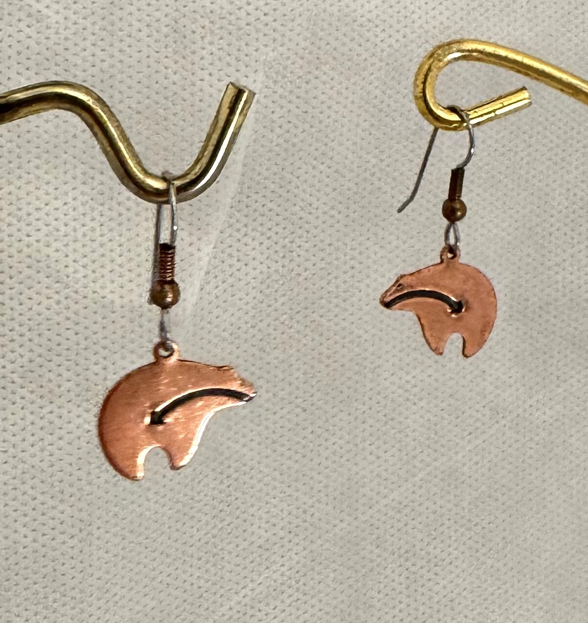 Spirit Bear Dangle Earrings 1.75" Bear is approx. 1.5" French / Shepard's Hook for Pierced ears COPPER TONE - Not sure of the metal as I could only do the magnet test and it does not stick to a magnet. No tarnish.