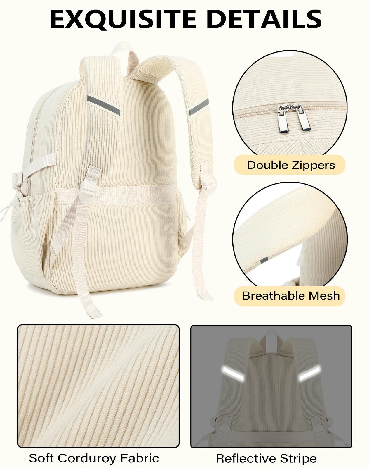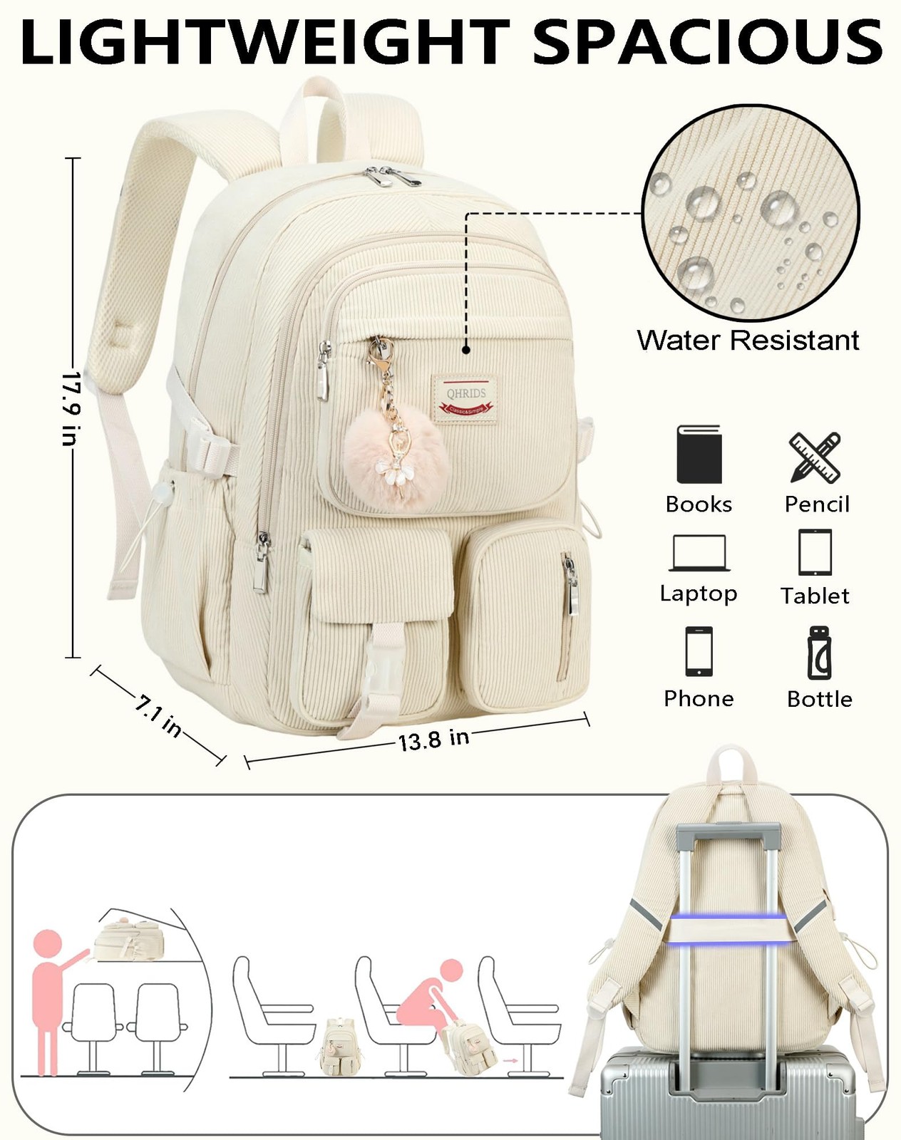 【Soft Skin-Friendly Material】 This school backpacks for girls is made of ultra-lightweight, ultra-soft, high-density corduroy fabric, which is soft and comfortable to touch. All seams are reinforced to ensure the student school bag is durable. This student school bag is made of high quality zipper, which is very smooth to use 【Five Different Colors and Patterns to Choose From】 There are five pattern designs for our backpacks, which are sweet strawberry pattern, fresh floral design, classic black, elegant beige and unique bow pattern. No matter which style you prefer, there is always one for you 【Large Capacity and Multi-compartments】 This girls' backpack measures 13.8*7.1*17.9 inches, with seven separate pockets of different sizes and two side pockets. Two front zippered pockets for small items and a buckle pocket for quick access; three larger zippered pockets for 15-inch laptops, iPads, textbooks, etc.; elastic side pockets for water bottles and umbrellas. In addition, a back anti-theft pocket keeps your belongings private 【Comfort and Convenience】The shoulder straps of the girls' school bag are padded with thick foam for more comfortable carrying. The reflective strips on this girls' school bag also improve visibility and ensure your child's safety on the way to school. In addition, the luggage strap on the back of the backpack can easily attach the laptop bag to the luggage trolley bar, making the trip more comfortable 【Ideal Backpack】 The simple and fashionable design of this girls school backpack can better match your daily clothes, the storage function is comprehensive and can meet most of the needs of students