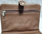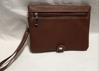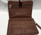 Folded the wallet/purse measured 9" x 6" but opens to double that size. Wallet has multiple zippered pockets and a section to hold many credit/debit/business cards. Two options for carrying include a loop wrist strap and a 48 inch shoulder/crossbody strap. Front has the Bible verse "With God All Things Are Possible" Mark 10:27.