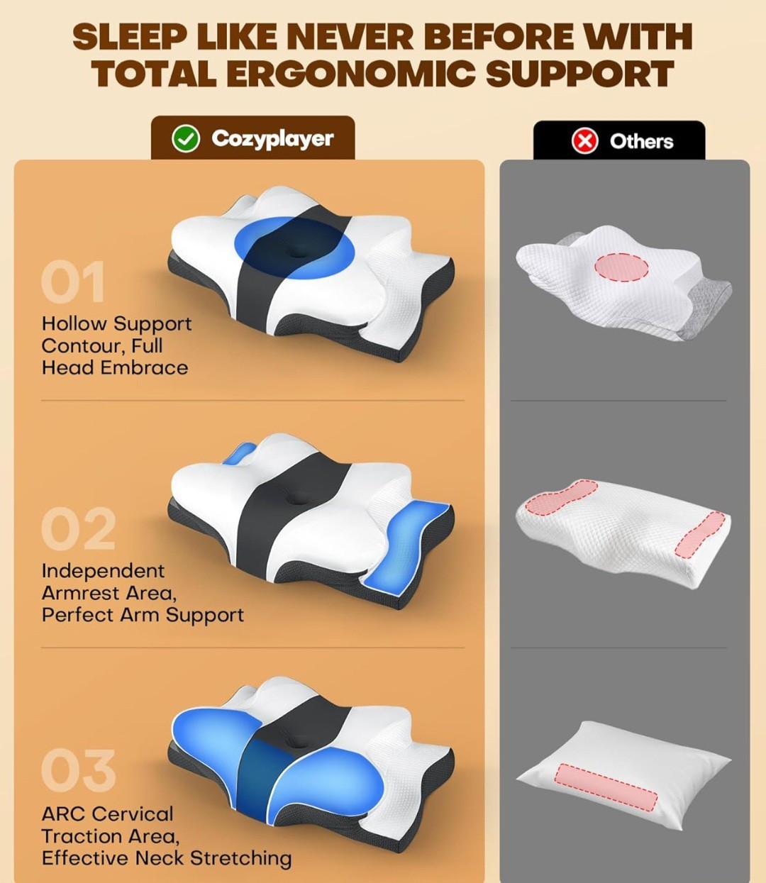 The Cozyplayer True Cooling Cervical Neck Pillow is designed to provide pain relief and support for the neck and armrest area. Made by the brand cozyplayer, this cervical pillow comes in a sleek charcoal color and features a cooling design to keep the area comfortable and cool while sleeping. Ideal for use in the bedroom, this pillow is perfect for those who struggle with neck pain and want a supportive and comfortable armrest area.