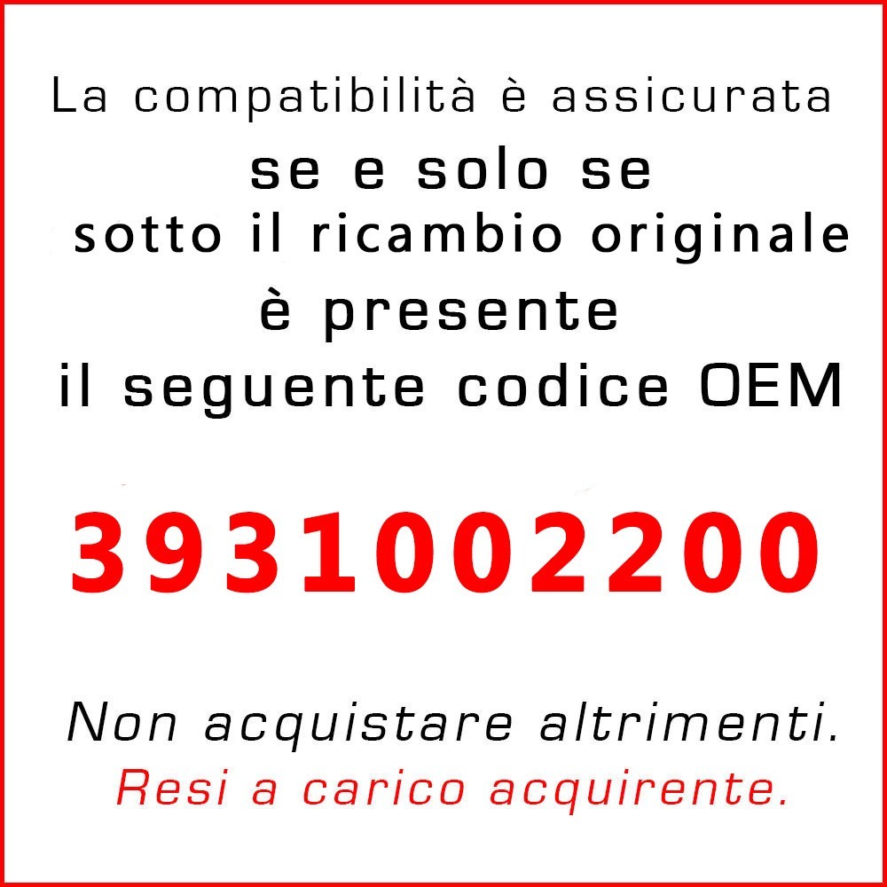 Vinciann Negozio Altre strepitose occasioni (clicca sull'immagine) Newsletter Rimani aggiornato su offerte e nuovi prodotti del nostro Store iscrivendoti alla nostra Newsletter. Iscriviti alla Newsletter Spedizioni Rapide Le spedizioni sono molto rapide. Spedisco sempre entro 24 ore dalla ricezione del pagamento. Spesso entro poche ore. Iscriviti alla Newsletter Aggiungimi ai venditori preferiti Sensore posizione albero a gomiti per Hyundai e Kia SPAG Caratteristiche del prodotto: Compatibilità veicoli: HYUNDAI Getz (TB) 1.1, Anno di produzione 09.2002 - 09.2005, 1086 ccm, 63 CV 1.1, Anno di produzione 09.2005 - 06.2009, 1086 ccm, 67 CV KIA Picanto I (SA) 1.0, Anno di produzione 04.2004 - 04.2011, 999 ccm, 61 CV 1.0, Anno di produzione 09.2007 - 04.2011, 999 ccm, 63 CV 1.1, Anno di produzione 04.2004 - 09.2011, 1086 ccm, 65 CV Codice ricambio sostituito: 3931002200 Specifiche tecniche: Materiali: In plastica e componistica elettronica Colore: Nero Connettore elettrico: 3 Pin Vantaggi e dettagli: Compatibilità perfetta: Progettato per adattarsi senza problemi al modello elencato. Alta qualità: Prodotto aftermarket con eccellente fattura e affidabilità. Confezione e spedizione: Stato: Nuovo. Disponibilità: Pronto per la spedizione immediata dall’Italia con Corriere Espresso. Nota importante per il cliente: Ti preghiamo di osservare bene le foto di questa inserzione, prima di effettuare l'acquisto. Controllare che forma e compatibilità del sensore siano le stesse di quelle della tua vettura. Spedizioni sicure ed assicurate È un prodotto nuovo , disponibile in magazzino (in Italia) e pronto per la spedizione immediata, tracciabile . Il servizio di spedizione che vi offriamo è sicuro, garantito e - ribadiamo - tracciabile, a differenza di Posta Prioritaria, servizio tanto economico quanto inaffidabile circa la consegna dei prodotti. Con noi potete rilassarvi! Le nostre spedizioni sono tutte assicurate fino all'intera spesa effettuata. In caso di incidenti riceverete un rimborso completo o procederemo ad una nuova spedizione. Newsletter Clicca qui per iscriverti alla nostra newsletter e rimanere aggiornato su offerte e nuovi prodotti esclusivi del nostro Store. Contatti Per qualsiasi dubbio o domanda su questo ordine non esitare a contattarmi ed a chiedere ulteriori spiegazioni.