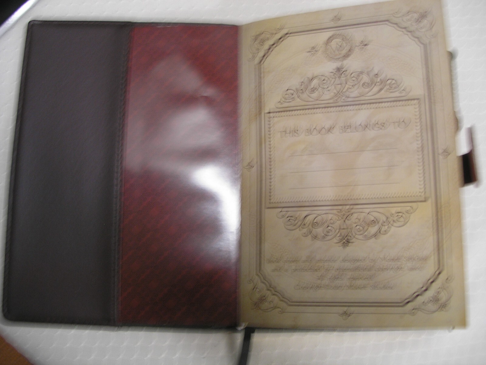 MADE OF LEATHER WITH GOLD EDGING A MAGIC ENCHANTMENT NOTEBOOK HAS PAGE MARKER COMES WITH PENCIL ONE PAGE HAS BEEN TORN OUT SOMEONES NAME IS PENCILED IT, SO CAN BE ERASED