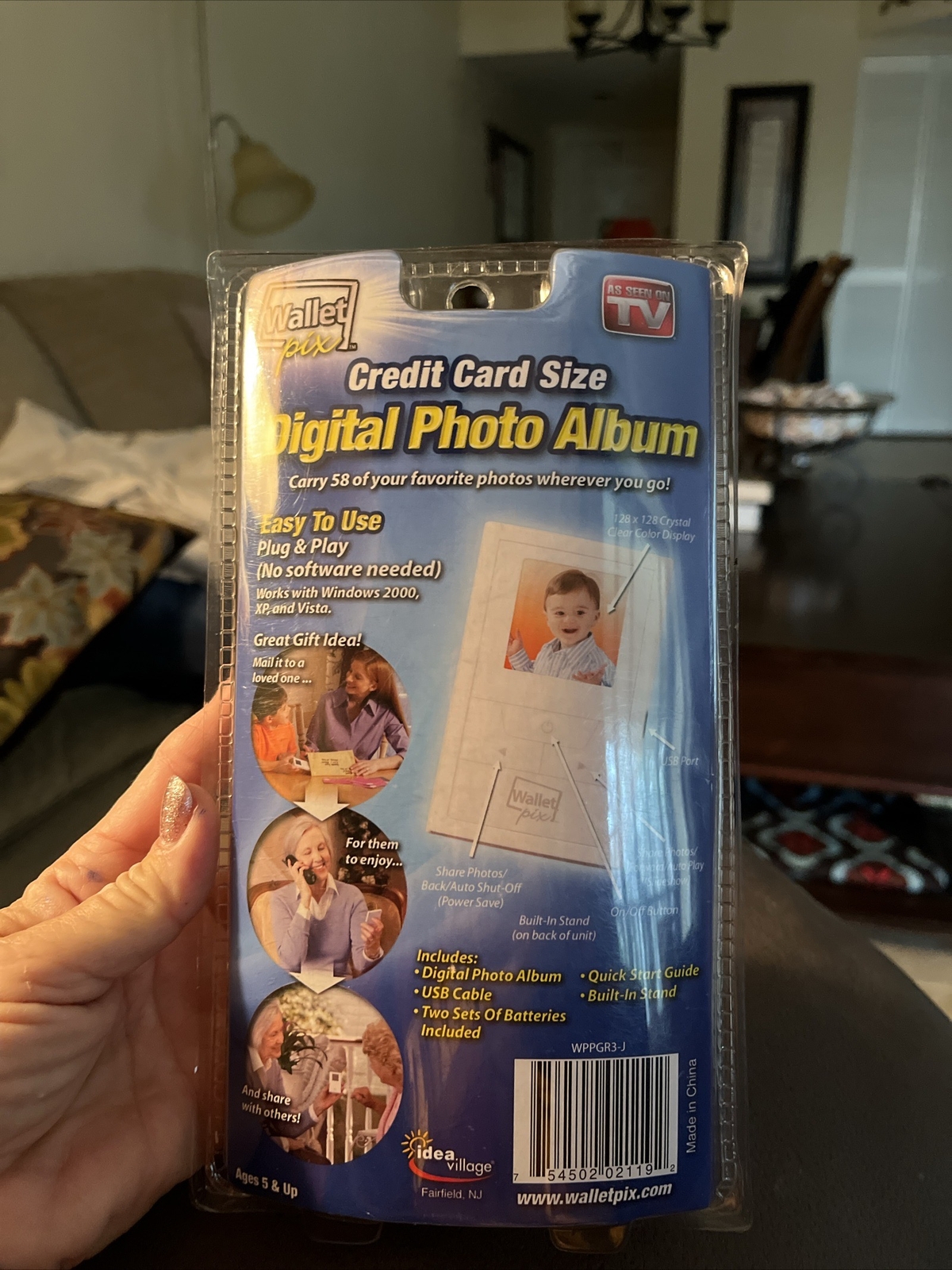 This Wallet Pix digital photo album is the perfect way to display your favorite memories. With the ability to display up to 58 photos, this credit card-sized device is a convenient and easy way to share your pictures with friends and family. Its 1.5 inch screen size allows for clear and sharp images, while its black color gives it a sleek and modern look. The Wallet Pix is compatible with PC connectivity, making it easy to transfer your photos and update your album. Plus, with its energy star rating of 3 stars, you can feel good about your purchase being both stylish and eco-friendly. Whether you're looking for a unique way to showcase your photos or a thoughtful gift for a loved one, the Wallet Pix digital photo album is the perfect choice.