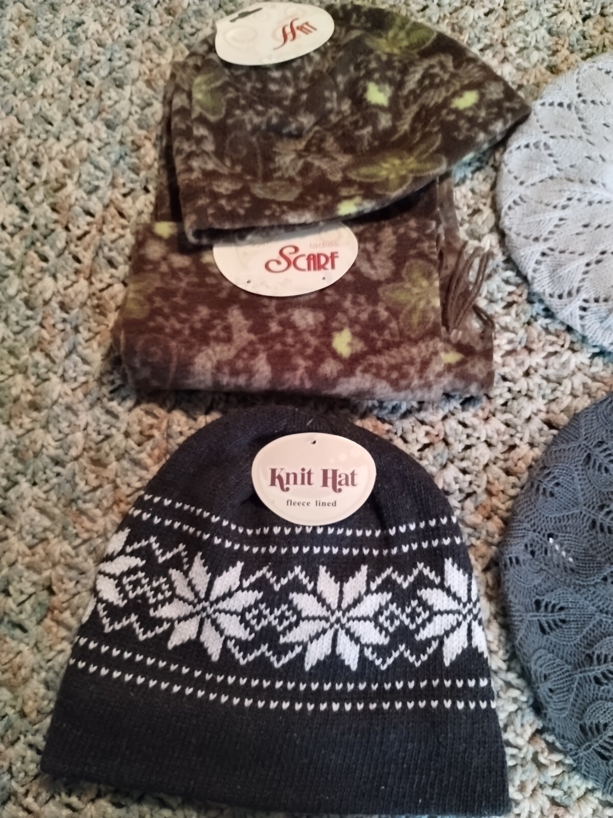 Super cute Earth tone green and brown floral with a splash of teal very lightweight hat and scarf set soft polyester. Fleece lined Gray snowflake knit hat and three Beret style 100% acrylic open knit lightweight one size. Cleaning out My closet message me any questions and check out my other items.
