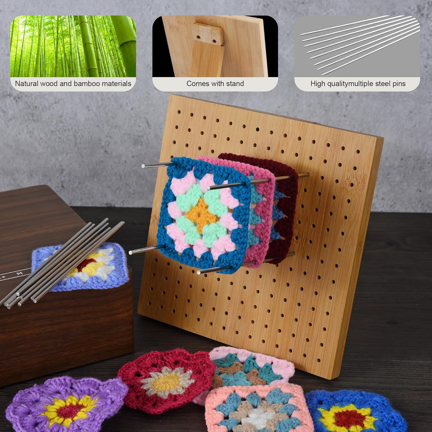 【Wooden blocking mats for crochet】: Size: 7.8" x 7.8". Thickness: 0.59". The knitting blocking mats and pins is made of high-quality bamboo and the base is made of pine wood. This is an ideal choice for beginners. 【Beginner-friendly crochet blocking board with pins】: There are 14 holes in each row and a total of 196 holes. Our knitted loom comes with 20 5.9-inch stainless steel pins. The hook and needle loom comes with the pins fit into the holes, and the corners are cut for convenient use. 【Durable blocking board for crocheting】: Foam boards can often become unstable after continued use due to many holes appearing when pins are inserted. However, our bamboo granny square blocking board can be used repeatedly and provides a cost-effective solution for your blocking needs. 【A practical and beautiful knitting mat】: This is a great choice for knitting enthusiasts, moms, and grandmothers alike. It is particularly suitable for blocking granny squares and small-scale blocking projects. The crochet blocking board with pegs can help make your knitting project look more professional. 【100% satisfaction guarantee】: A must-have on your shopping list. Our customer service team is always by your side! We offer a 30-day refund service, so if you have any issues with our blocking mats for knitting, please contact us and we will solve the problem within 24 hours. Crochet Blocking Board