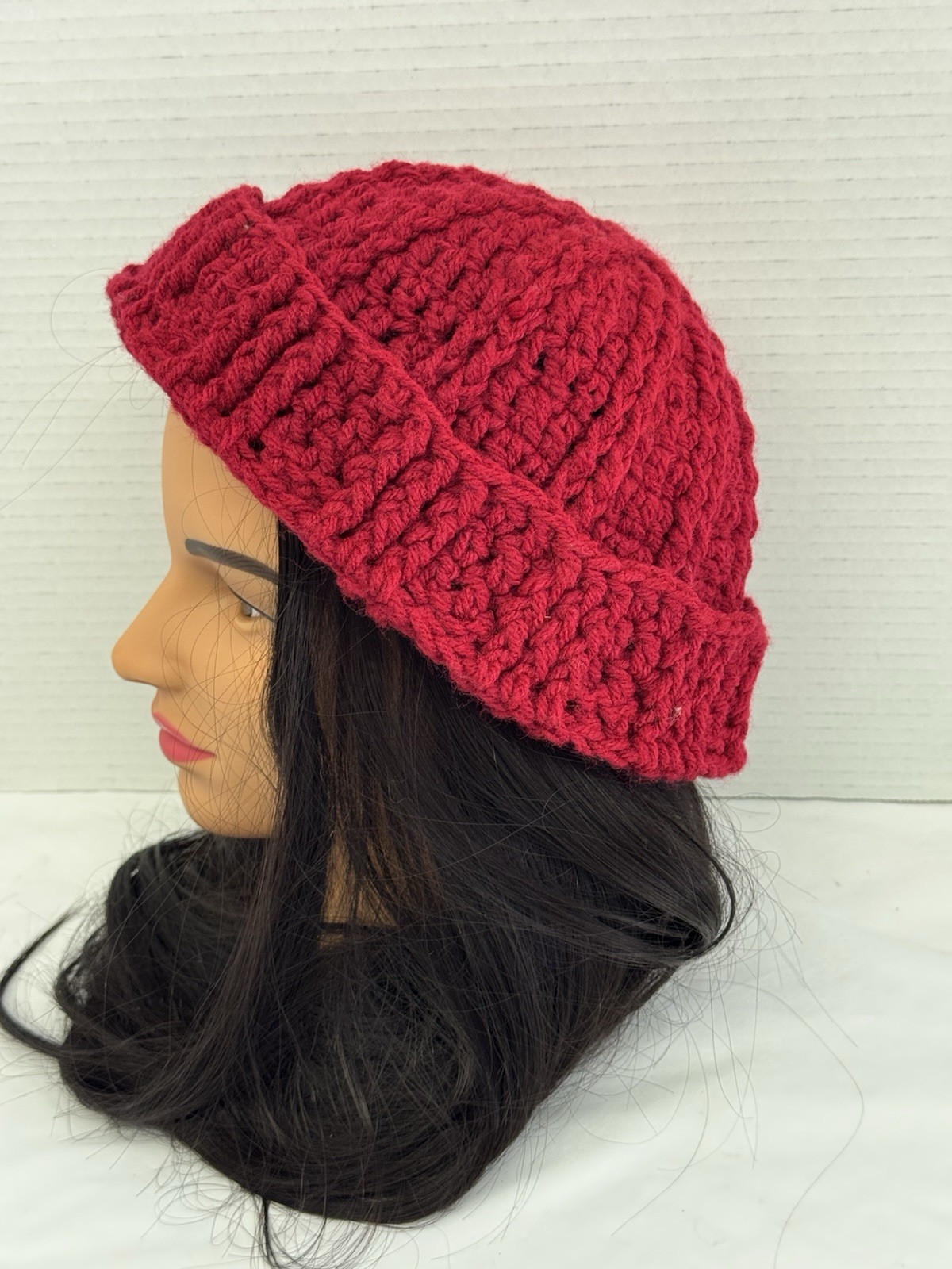 This is a handmade beanie skull hat. Sailor fashion with wide brim all around. Can be worn by male or female. Teen or Adult. Handmade Crochet can be worn by male or female. Deep Dark Red, Maroon or Burgundy color. Has a comfortable pull on fit. Machine washable tumble dry low or air dry. From a smoke free and pet free home.