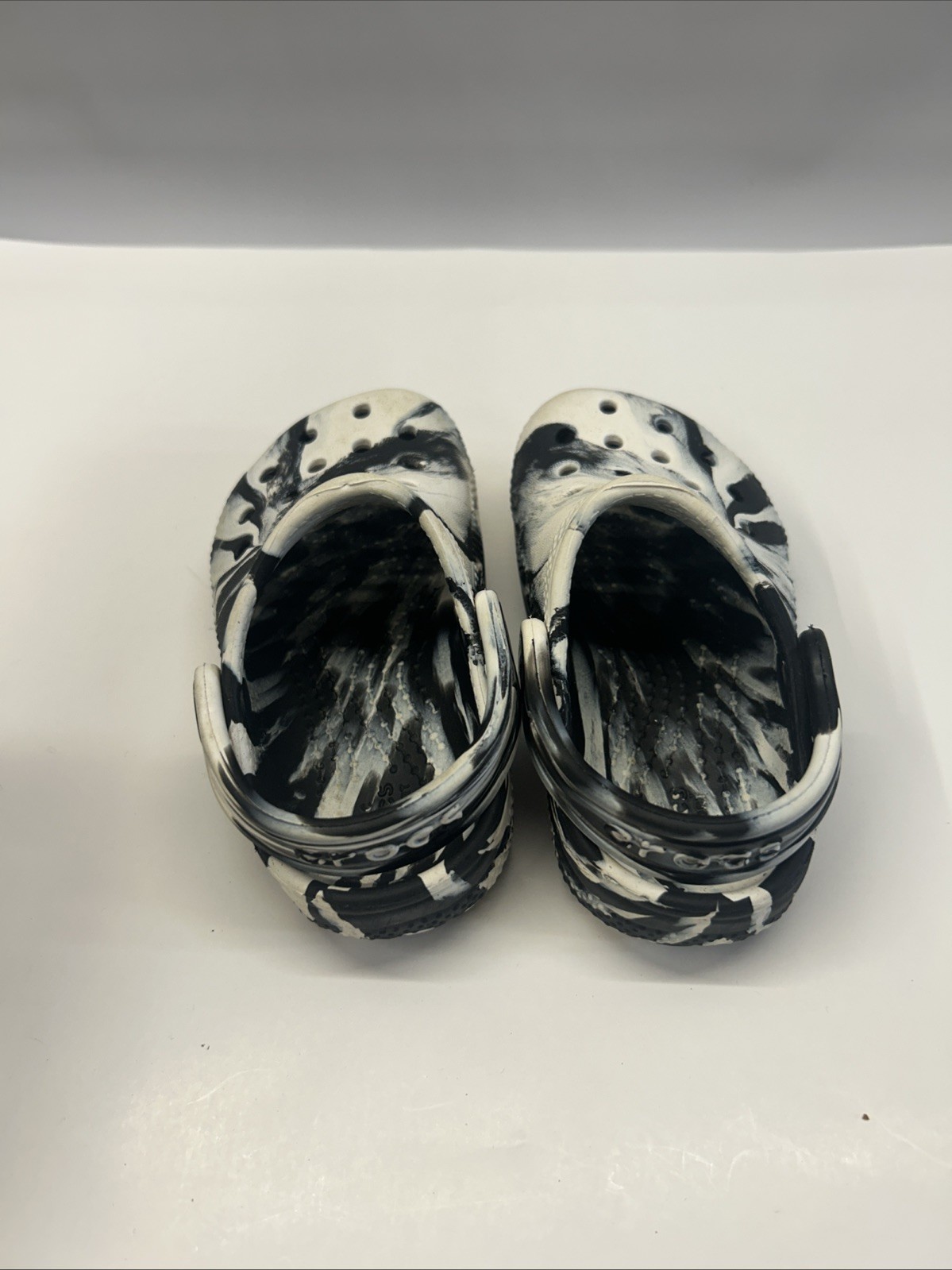 The product is a pair of Crocs Classic Marbled Clog Shoes in Black and White Tie Dye, designed for unisex kids in size 6. These slip-on shoes feature a round toe shape and tie closure, making them easy to put on and comfortable to wear. The classic clog style and tie-dye pattern add a fun and stylish touch to the shoes, suitable for all seasons. Perfect for casual wear during winter, summer, fall, or spring, these Crocs are a versatile yet trendy addition to any child's wardrobe. Look at all pictures. A7