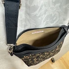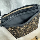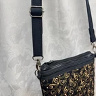 Elevate your accessory collection with the Pink Kiss Purses Crossbody Bag, a harmonious blend of style and practicality. Featuring a distinctive music notes pattern set against a sleek black backdrop, this medium-sized bag is crafted from a durable blend of canvas, cotton, and vinyl, ensuring both resilience and elegance. With a versatile silver hardware complement, the bag offers a sophisticated touch to any outfit, be it for casual outings, formal events, or travel. Functionality meets fashion with this bag's thoughtful design, including a secure zip closure, ample outer pockets for easy access, and a comfortable cross-body strap that adjusts up to 26 inches for a perfect fit. The interior is lined with a soft beige canvas, adding a gentle touch to your belongings. Whether you're headed to the office, attending a cocktail party, or enjoying a night out, this Pink Kiss Purses Crossbody Bag is a timeless companion.