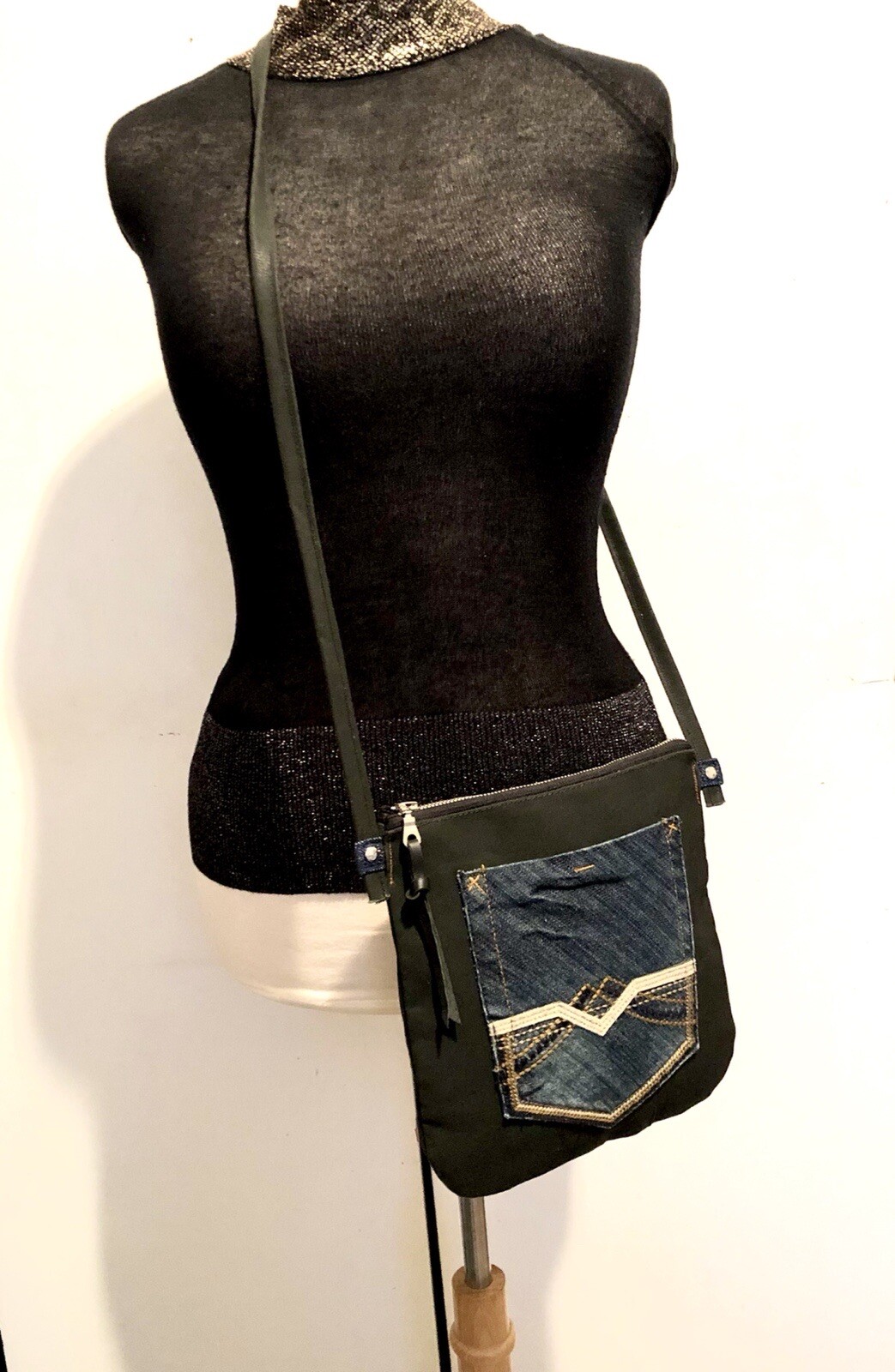 Handmade from a black canvas fabric, it’s a lined bag. zipper as a closure, inside & outside pockets, is an everyday light bag to carry all your necessities. W 10” H 10” 48” long handle