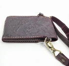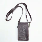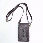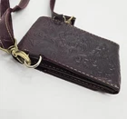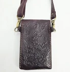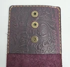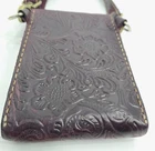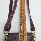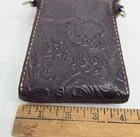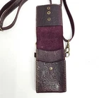 Hand tooled genuine leather crossbody bag in merlot burgundy, featuring tooled details. This small-sized bag has a rectangular shape with a snap closure and suede lining. It comes with an adjustable crossbody strap, making it suitable for various occasions like travel, parties, or workwear. This lightweight and classic bag exudes a Western and bohemian theme Great pre-owned condition