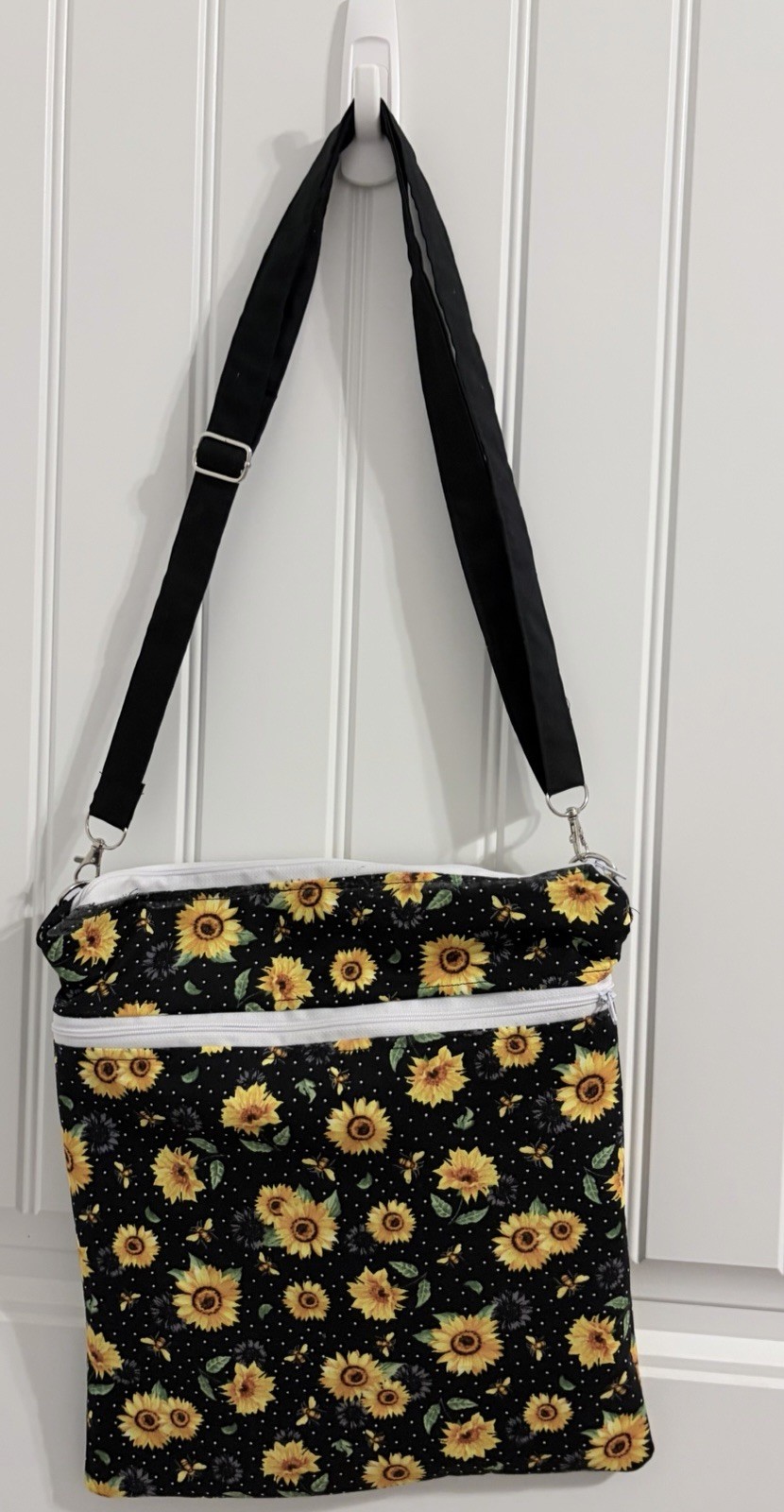 This handmade crossbody bag features a vibrant sunflower design with a multicolor exterior and silver hardware accents. The bag is medium in size with a zip closure and a lined interior. It includes an adjustable and removable crossbody strap made of cotton, making it perfect for casual occasions and everyday use. The sunflower pattern adds a whimsical touch to the overall design, while the black lining creates a clean and contrasted look. Ideal for women who appreciate unique and handmade accessories, this bag is a stylish and functional addition to any wardrobe.