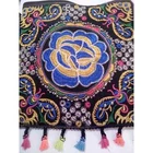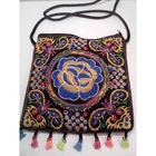 This bag has an Eastern Indian Vibe and the designs are Stitched using almost Neon Colors and Metallic Gold Thread. A Zippered Pocket Inside. Light and Sturdy Construction. Bag is 11" x 10" and the Soft, Braided Strap is 22" long.