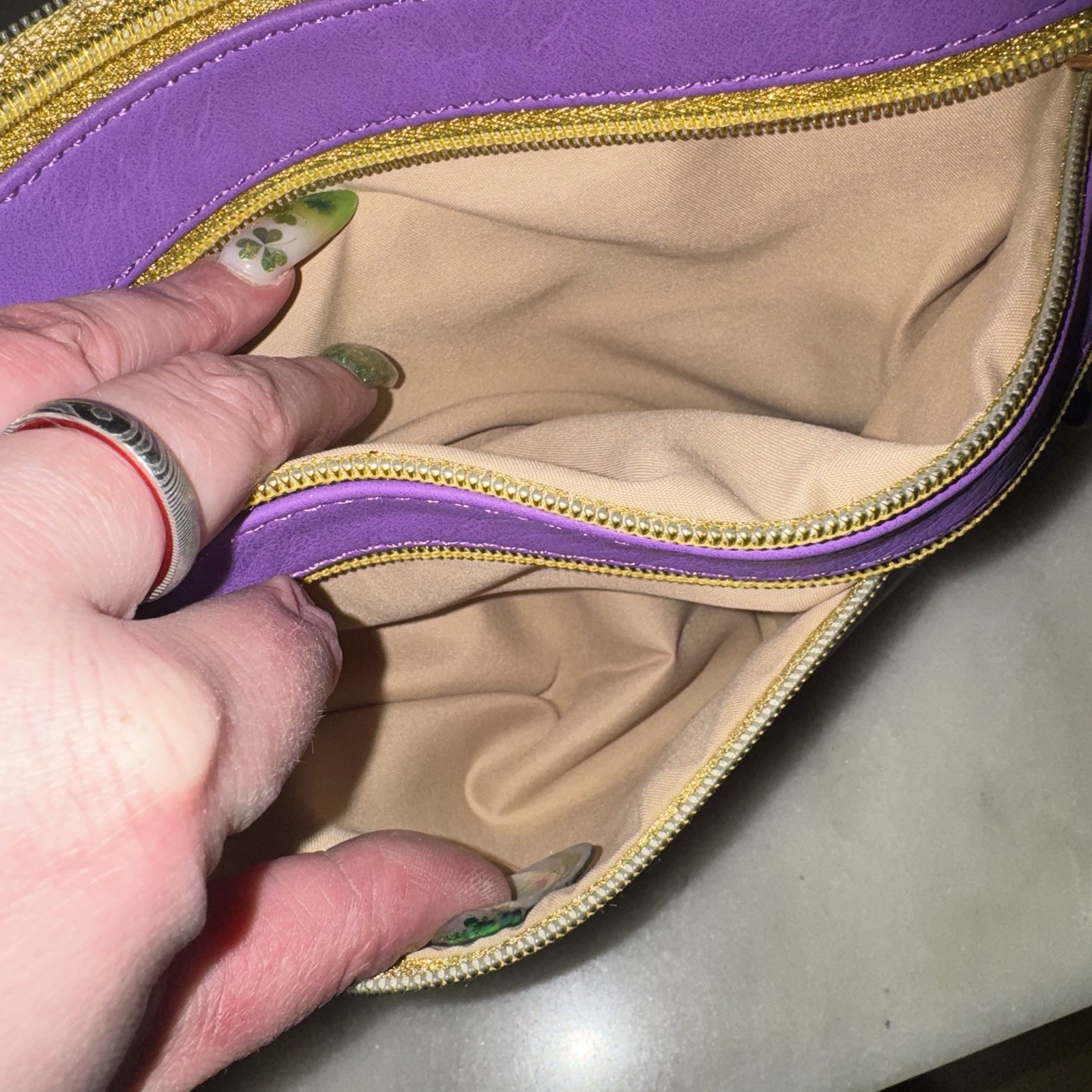 Definitely one of the cutest most unique bags. It’s purple with gold hardware. Two zipper compartment on the front that are very roomy. Also a zipper compartment inside the bag and 2 pockets. The bag itself has a zipper closure. Comes with a detachable strap. Brand new, never used.