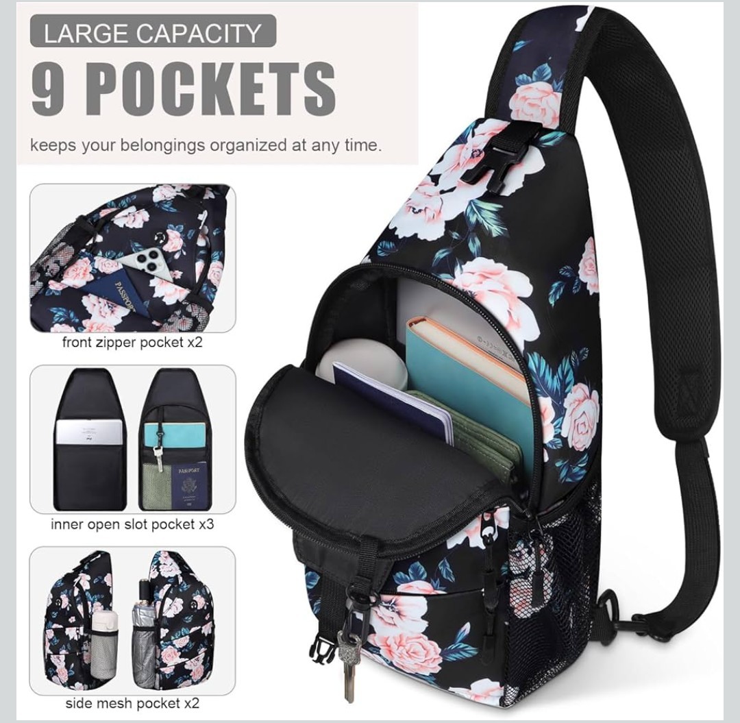 Crossbody Bags for Women Men Trendy Sling Bag Backpack Casual Chest Bag with Convertible Shoulder Strap Adjustable Strap For Both Sides:Our Medium Size (7.5*3.5*14.5inch) crossbody bags have one D-ring on each side of the bottom, and a detachable shoulder strap buckle. You can attach the strap for easy access on your left or right shoulder, reducing the strain of carrying your bag for a long time. The strap can be extended up to 39 inches to accommodate different body sizes and you can adjust the length to your comfort. Well Organized- Multi-pockets: You don’t have to waste time searching for things in a cluttered bag! We have 2 front zipper pockets and a buckle pocket that can fit your wallet, power bank, and tissue. The main pocket has enough space to fit all the essentials you need, it has 12 open pockets can easily store your iPad, cosmetics, or other essentials. Side mesh pocket can store anything you need for easy access. A special hook for hanging your keys! Have everything you need within reach! Durable & Waterproof Material: Our chest bag are built to last with thick, durable, and abrasion-resistant fabric. The material is also waterproof and tear-resistant, whether you’re hiking through rough terrain or commuting in the rain, our backpacks will keep up with you, ensuring that your belongings stay safe and dry. The backpacks are designed to be lightweight and comfortable, making them perfect for long hikes or daily commutes. Comfortable and Safty: Designed with a soft, breathable mesh back panel which is especially important for people who are carrying heavy loads or hiking in hot and humid weather, it not only provides a comfortable carrying experience, but also isolates the items inside the bag from the skin, prevent discomfort caused by friction. The shoulder straps are designed with reflective strips to ensure you are more visible, so enjoy the fun of outdoor exploration without any worries. Practical And Pleasing: Are you looking for a classic and versatile cross body bag that never goes out of style? Pritent crossbody bags are an ideal product that combines fashion, convenience, and performance. The perfect stylish appearance easy to match various styles of outfits.And there is a hidden headphone hole on the front that provides easy access to your headphones, without the hassle of tangled cords. It’s a great way to stay connected to your favorite tunes while on the go!
