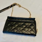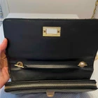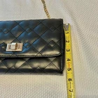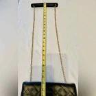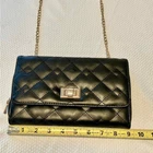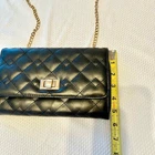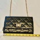 Faux leather crossbody bag in black with gold hardware. Chain strap, zip closure, multiple pockets inside. Quilt stitching on outside. Excellent preloved condition. Photos were taken in natural daylight. Please zoom for details. All listings are cleaned and packaged to ship after photos.