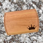 Design: Personalized Crown Cutting Board or Charcuterie Serving Tray All items ship via USPS - please make sure your address is correct :-) Whether used as a charcuterie serving tray for snacks or cutting board, our bamboo, walnut and cherry custom boards are the perfect addition for the home and make the perfect gift for your loved one celebrating a birthday, anniversary, new home, wedding, etc! *** FEATURES *** • SIZES: We have multiple styles and sizes available. To see our current sizes available, click the drop-down menu. The photo slide contains a photo showing each side by side. Please note, the board with the juice groove only has the groove on the front side of the board. • THICKNESS: Bamboo Boards - Approximately 1/2" Thick; Walnut & Cherry Boards - Approximately 3/4” Thick • UNIQUE: Every board is unique with the grain and coloring varying throughout - no board is the same! • CARE INSTRUCTIONS: Hand wash only with warm water. Do not soak. Please apply mineral oil throughout the board’s life. • PERSONALIZATION/CUSTIMIZATION: Do you want the text placed differently on the board? Please don’t hesitate to contact us. All personalization notes can be entered in the personalization box when checking out. • SHIPPING: All cutting boards ship within 2 to 5 business days. • WHOLESALE ORDERS: Please don’t hesitate to contact us for information about wholesale orders. Processing times for larger orders may change. • NOTE: Colors can vary a bit on different monitors and screens. Any props included in photos are not included. Please be sure to double-check your address to make sure it is accurate for USPS delivery. If a package is returned to us due to an invalid address, the buyer is responsible for all additional shipping charges. We appreciate you supporting small business – best wishes! For items ordered with simple edits, we do not send proofs since the layout doesn't change from the example(s). However, in the event there are requests that change the layout from the example(s), we do send proofs for approval before making the product. If you'd like a proof before we make the product, please note so in the personalization box.