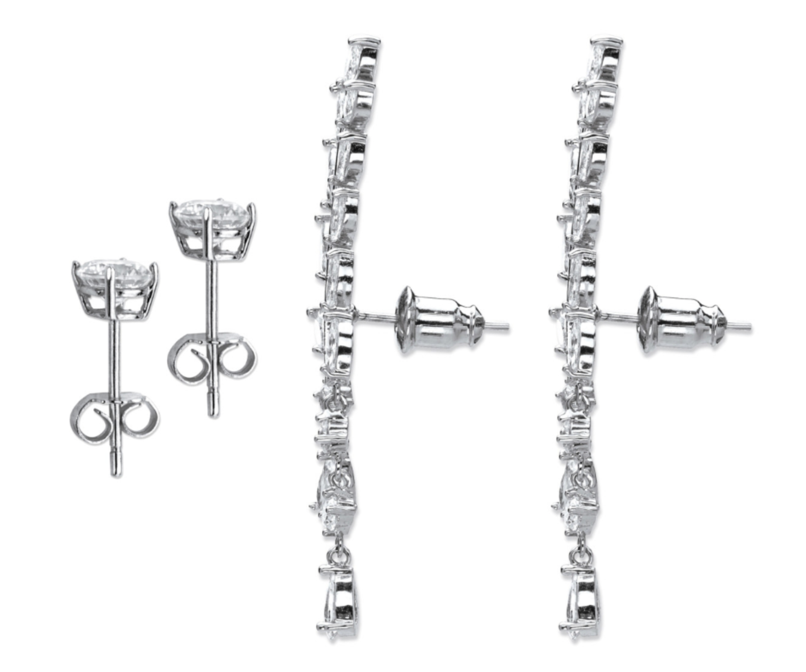FREE WORLDWIDE SHIPPING !!!!!!! Give her the gift that's both timeless and trendy with this beautifully presented 2-pair earring gift set. Featuring trendy marquise-cut cubic zirconia ear climbers in silvertone, complemented by classic round studs crafted in sterling silver. 3.96 carats T.W. Beautifully presented in a black gift box with lavender bow tie. ITEM SPECIFICATIONS: EARRING METAL INFORMATION Silvertone Finish Type: Bright Height: 1/10" Length: 1 3/4" Width: 1/3" Style: Ear Pin Type: Pierced Post Type: Surgical Steel / Hypo Allergenic STONE INFORMATION Cubic Zirconia (Accent/Small Stone) Quantity: 6 Carat Weight: .900 Carat TW Size (mm): 5x2.5 Cut: Marquise Make: Simulated Setting: Prong STONE INFORMATION Cubic Zirconia (Accent/Small Stone) Quantity: 14 Carat Weight: .980 Carat TW Size (mm): 3.5x2 Cut: Marquise Make: Simulated Setting: Prong STONE INFORMATION Cubic Zirconia (Accent/Small Stone) Quantity: 6 Carat Weight: .360 Carat TW Size (mm): 2.5 Cut: Round Make: Simulated Setting: Prong STONE INFORMATION Cubic Zirconia (Accent/Small Stone) Quantity: 4 Carat Weight: .720 Carat TW Size (mm): 4x2.5 Cut: Pear Make: Simulated Setting: Prong ITEM 2 SPECIFICATIONS: EARRING METAL INFORMATION Sterling Silver Finish Type: Bright Height: 1/8" Length: 1/6" Width: 1/6" Style: Stud Type: Pierced
