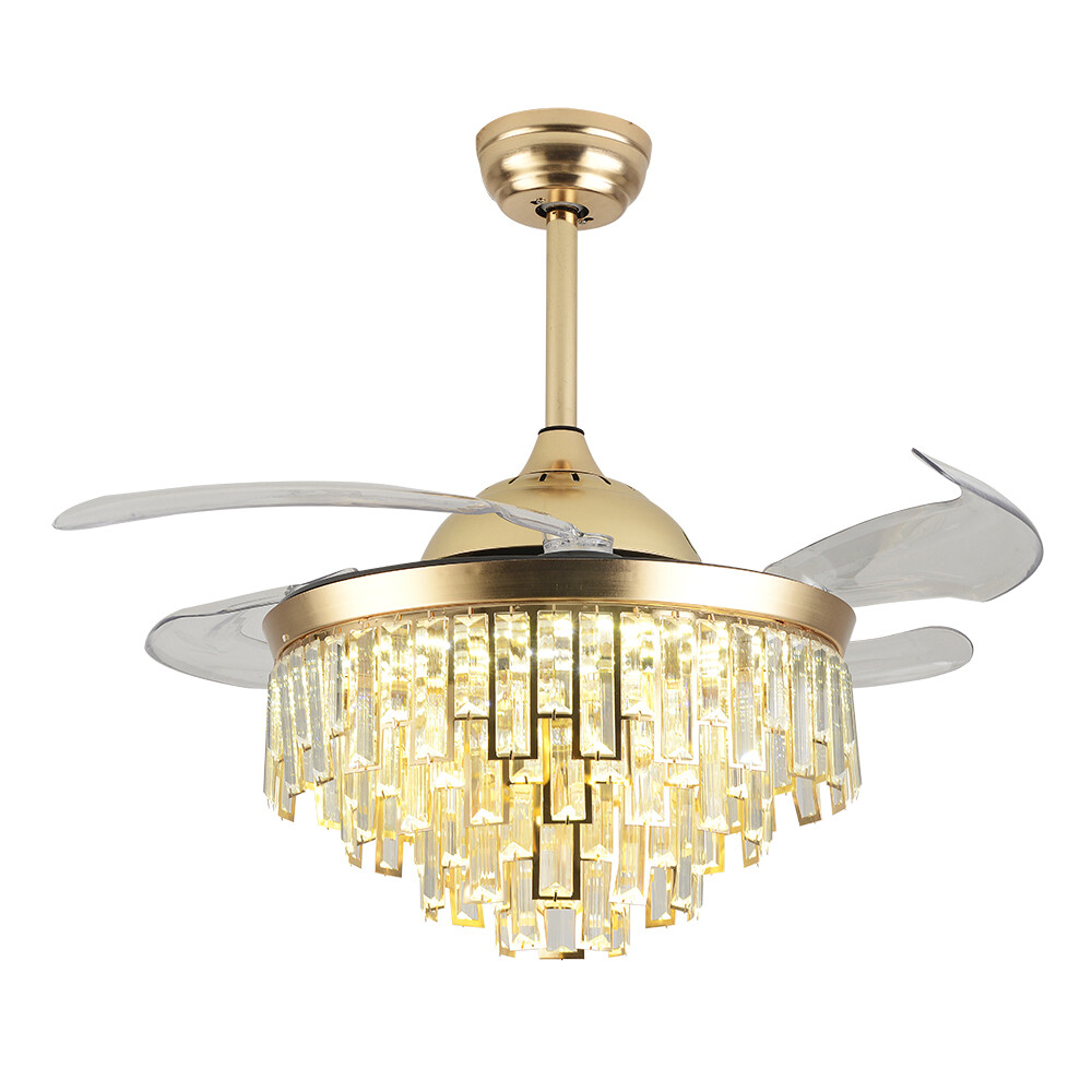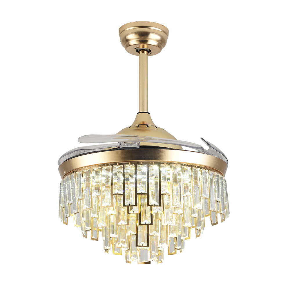 Crystal Dimmable LED Chandeliers 42" Retractable Ceiling Fan with Remote Control Crystal Retractable Ceiling Fans with Light LED Dimmable Chandelier Living Room About this item 【 Remote Control 】 Integrating turn on light with 3 color changes (white, warm white, neutral white)3 wind speeds (low, middle, high), you can use the remote control to choose the color you like. 【 Invisible Ceiling Fan 】 With retractable ABS blades, the blades will stretch out and put inside automatically when turned on and off the fan, saving space for your room. 【 Glass strip 】 Absolute stunning when lights turned on, make your room full of luxury sense. 【 Applications 】 Ideal for living room, dining room, foyer, villa, bedroom, restaurant, study room, and other places to decorate lighting fixtures. 【 Customer Service 】 If you have any issues, inquiries or need assistance, please feel free to contact us, we will try our best to help you. Style: Modern Color: White Type: Ceiling Fan Chandelier Light Source: Led Lighting Board(Include) Switch: remote control 3 fan speed: low/medium/high Light color: 3 regular colors change by remote Timing function: 1/3/6 hours Voltage: 110V ( FIT YOUR COUNTRY ) Wattage: 36-40w Applications: 8-25 ㎡, Living Room, Ding Room,Bedroom, Study Room, Corridors, Foyer, Kitchen, Restaurant, bar, coffee shops etc Dimension: Diameter:42in /107 cm(blades open) Total height:53/68cm ( depends on downrods ) Lampshade diameter:18in/46cm DownRods:10CM/4in +25CM/9.8in (Two rods, installed according to your ceiling height) Lampshade:glass+metal frame Blades: Acrylic Electronic materials: Steel+ copper wire Material: High quality Acrylic lampshade, Plating metal Warm Tips: This fan needs basic assembly, professional would be highly recommended. Floor height is greater than 110", ceiling load is greater than 25kg. Payment Delivery details Terms of sales About us Contact us Payment We accept ebay payment 。 Fees such as import duties, taxes are not included in the item price or shipping costs. These charges are the buyer's responsibility. Delivery details Shipping: 2-9 working days to: USA Terms of sales We maintain high standards of excellence and strive for hundred percent customer satisfaction. Feedback is very important to us. We hope that you contact us immediately before you give neutral or negative feedback, so that we can address your concerns. It is impossible to address issues if we do not know about them! About us Your satis faction is our ultimate goal. We work hard to earn your trust and future business. Our certified technicians have tested each item before shipping. The unit comes with 1 year limited warranty on all manufacturing defects. a) If you receive a defective item, you may return it or ask for a discount. Please contact us within 14 days after you receive the package. b) What you returned must be intact and in its original packaging as re? u. Customer is responsible for shipping costs of the returned item. c) We will cover the cost of shipping back t with the shipping rate indicated in the registration page. We will send you a new unit or refund the full payment you paid. Thank you. Contact us Business Hour Business Hour: Monday To Friday: 8:30 AM to 5:00 PM (Beijing China time) Due to time zones, our reply to your questions may not be immediately. But within above working time, we will reply your email within 24 hours. If it's non-workdays, please kindly be patient and wait till Monday. Please contact us with ebay message. Please feel free to contact us if you have any questions. Monday To Friday: 8:30 AM to 5:00 PM (Beijing China time) Due to time zones, our reply to your questions may not be immediately. But within above working time, we will reply your email within 24 hours. If it's non-workdays, please kindly be patient and wait till Monday. Please contact us with ebay message. Please feel free to contact us if you have any questions.