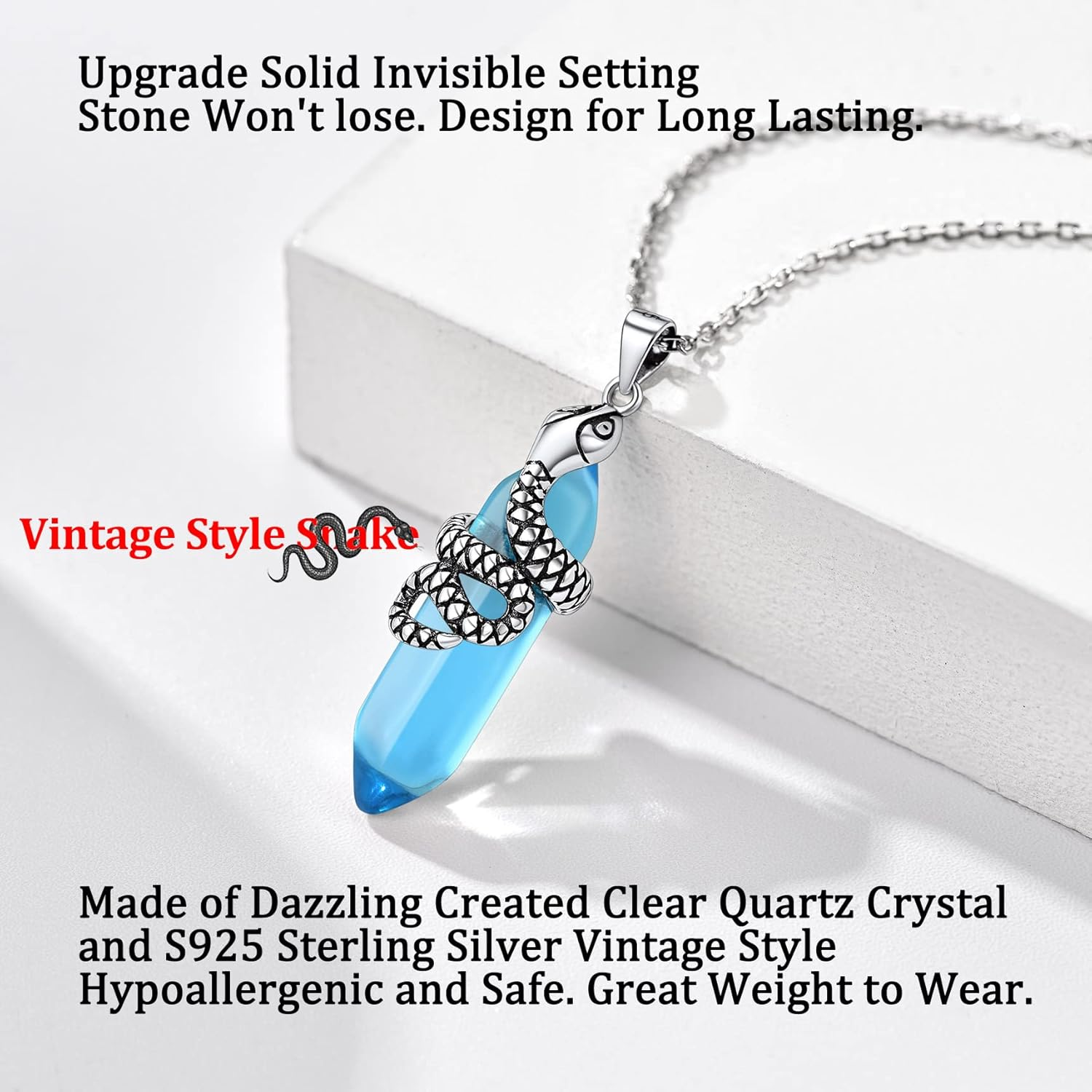 Crystal Necklace Sterling Silver Olive Leaf/Snake Wrap Clear Quartz Birthstone Pendant with Dainty Silver Rolo Chain, 18"+2", Great Birthday Gift for Women Girls Product Description Stylish Snake Necklace, Every Day Wear Jewelry Vintage Sterling Silver Snake Wrap Crystal, Exquisitely Made , Gothic and Unique Bezel Setting, Invisible and solid, stone wont lose. High Polish comfort fit, every day wear jewelry As Healing Crystal Necklace, Birthstone Necklace Gift, Party Necklace, Dainty Casual Necklace Metal stamp 925 Sterling Silver Chain Rolo Gem Type created aquamarine Color 03.Snake Wrap Hexagon Aquamarine-March Material Sterling Silver Metal Sterling Silver Model number BTP27159V-3-EUB Setting Invisible Department boys Number of stones 1 Clasp Lobster Manufacturer Jewelry (n/a) Shipping from the USA All of our products are shipped from the USA, ensuring quick delivery to your destination. Payment We offer the following payment methods: PayPal, credit card, bank transfer, and eBay's secure payment system. Free Shipping & Free Returns Shipping within the USA is FREE. Additionally, any return is absolutely free for you. Risk-Free Purchase You have the option to return an item within 30 days without any justification. We cover the return shipping costs! Fast Shipping We ship immediately upon receipt of payment. Generally, the package is delivered within 2-3 days in the USA. If it takes longer, we will contact you. Quality and Costs Made in Europe, USA, China No customs fees or additional charges Total satisfaction guarantee Invoice with declared VAT available upon request in .pdf format Feedback Your feedback is very important to us. After you pay for your purchase, you will automatically receive positive feedback from us.