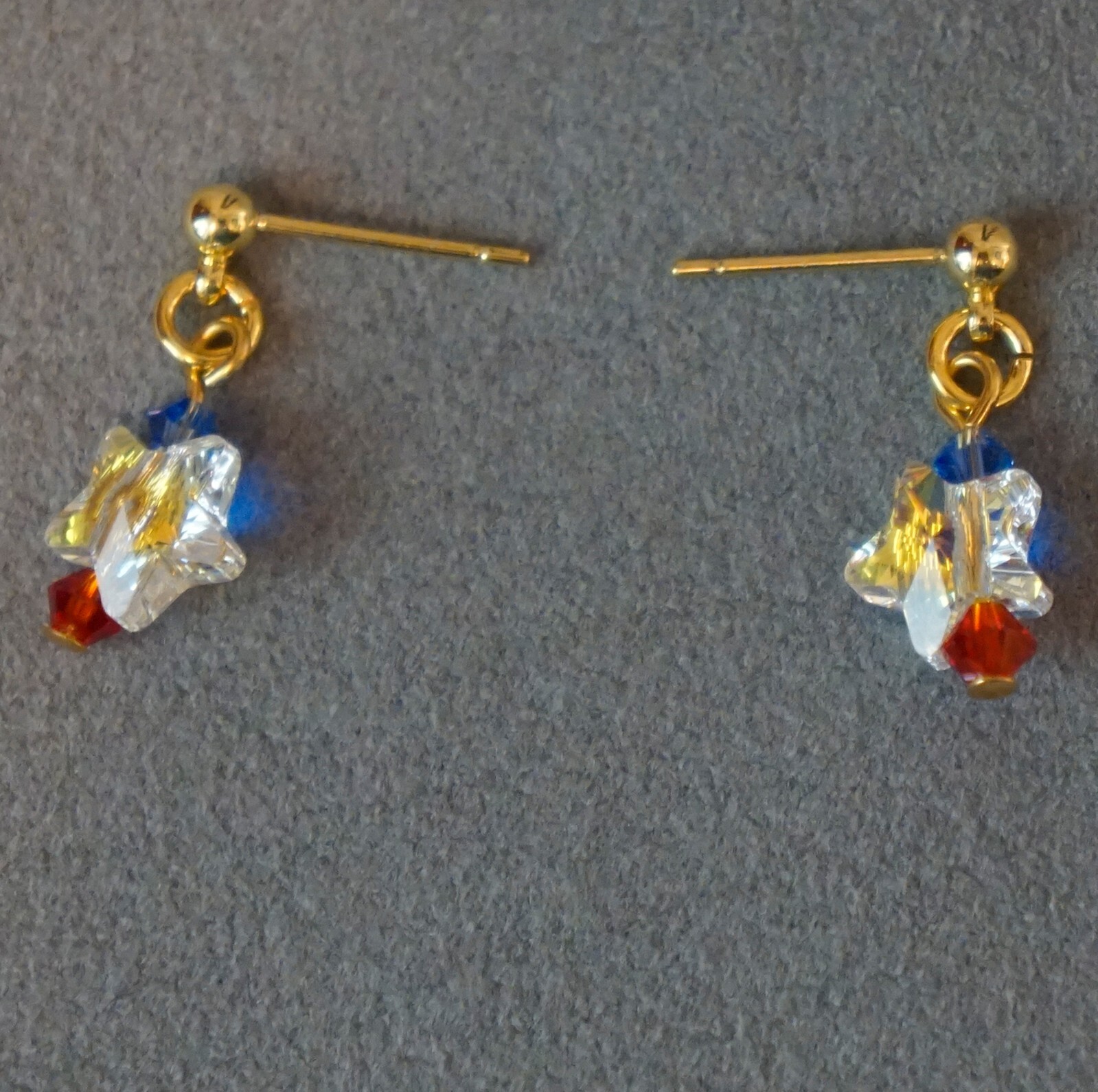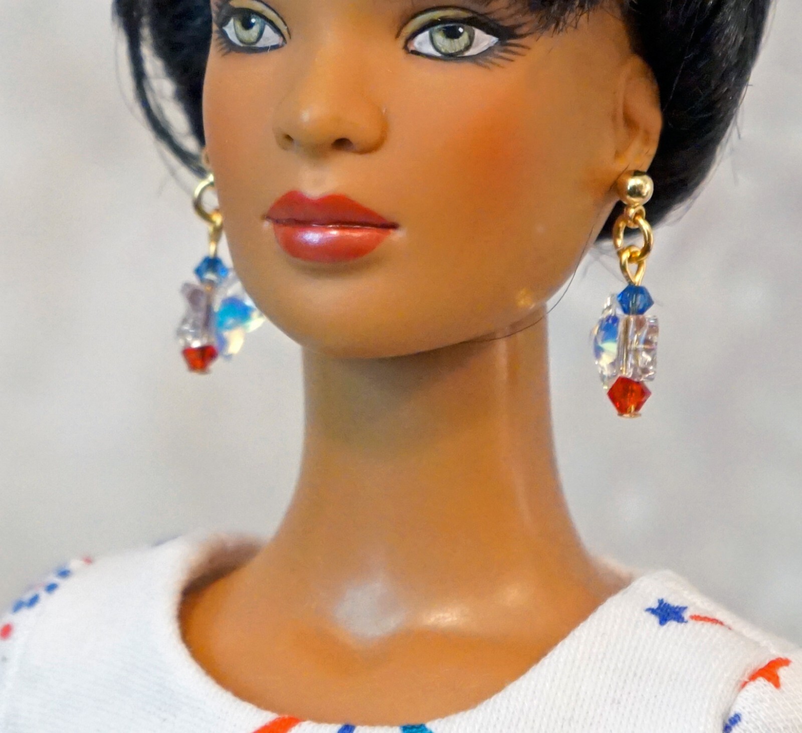 I use only the finest Austrian crystal, natural stone, and specialty beads. There are no cheap glass imitation or acrylic beads in any of my jewelry. The metal findings are gold, silver, or gunmetal finish and clasps are either magnetic or claw spring clasps. Earrings are made with 3mm or 4mm ball earring posts or specialty earring posts - no chopped off eye pins. This item is made using an AB crystal star with red and blue seed beads on a 3 mm gold earring posts. The earrings are shown on a 16 inch fashion doll but could be worn by any doll with the necessary holes to insert earring posts. I sell only through ebay for your protection and mine. Note: FREE SHIPPING to USA locations and discounts for purchasing multiple items. Thanks for viewing my listing. I hope you make a purchase and come back often.
