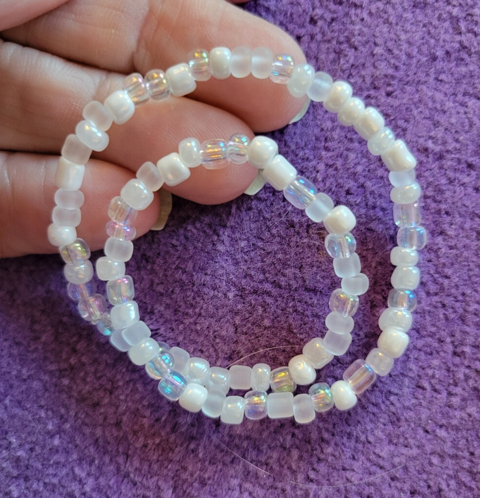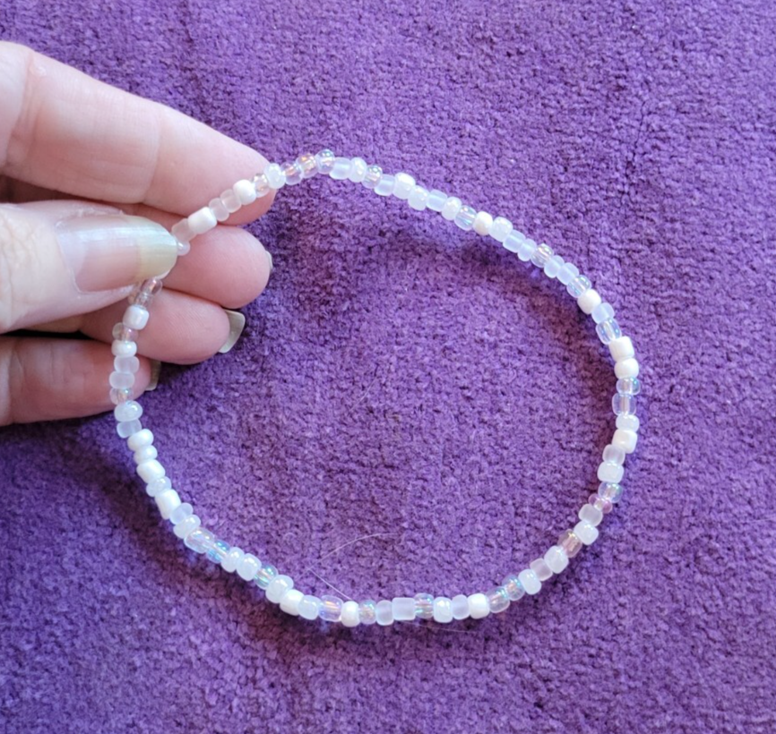I make ALL of my Anklets in Sizes 9 1/2, 10 1/2, 11 1/2 & 12 1/2. If you need Another Size, just let me Know in the Sales Notes. ~~ 0028900~~ ~Please scroll DOWN to view the entire Listing~ (To use the Magnifying tool to read Tags/Labels and see Closeup views, please choose a picture with your cursor, and then Hold your cursor over the picture. A small magnifying box should appear and will Allow you to see Closeup.) **Crystal White Snow Bead Beaded Anklet - Energy Life Breath Love - Fun & Unique 9 1/2" ** This Anklet is Really Nice, in Excellent Condition, Strung on Strong Elastic for Easy On and Off and a Great addition to Your Wardrobe. Dimensions: 9 1/2" Long Perfect for Yourself or as a Gift! Note to Buyer: I'm sorry postage is so expensive, but I choose to ship your item in a box, so it will arrive undamaged. Also, I Can Create ANY Color Combination of Beads for my Anklets. Just let me know if You Would like a Special Order. No Extra Cost. ~~I'm Great to deal with. Check out my Feedback and my Other Auctions!~~ A+ seller! Super fast shipping, lovely anklet, thank you! I am a repeat customer!!! ~aileen257 Love these ankle bracelets. Shipped fast! ~ikosokar Nice item. Fast delivery. Great communication! ~cinmor99 Item just as described, super fast shipping. Great Ebayer. A++++ ~jennifer315 Please leave Positive & Glowing Feedback and I will be happy to do the same! ~~~~~~~~~~~SMOKE FREE HOME!!~~~~~~~~~~~ Thank you for reading the ENTIRE listing before placing a bid. ~~ Payment MUST be received within 6 days ~~ POLICIES: PLEASE READ BEFORE YOU BID ~Please Ask all Questions BEFORE Bidding - Returns on a Case by Case basis only~ Please read the entire listing BEFORE bidding. **By placing a BID on this item, you are AGREEING to Make Payment and abide by ALL terms, directions & descriptions in this listing.** The Pictures Show the Type of Item you will Receive. The Bead Colors will be the same, but the Bead patterns will be slightly different on the Item you Will receive. Thank You for Checking out This Listing.