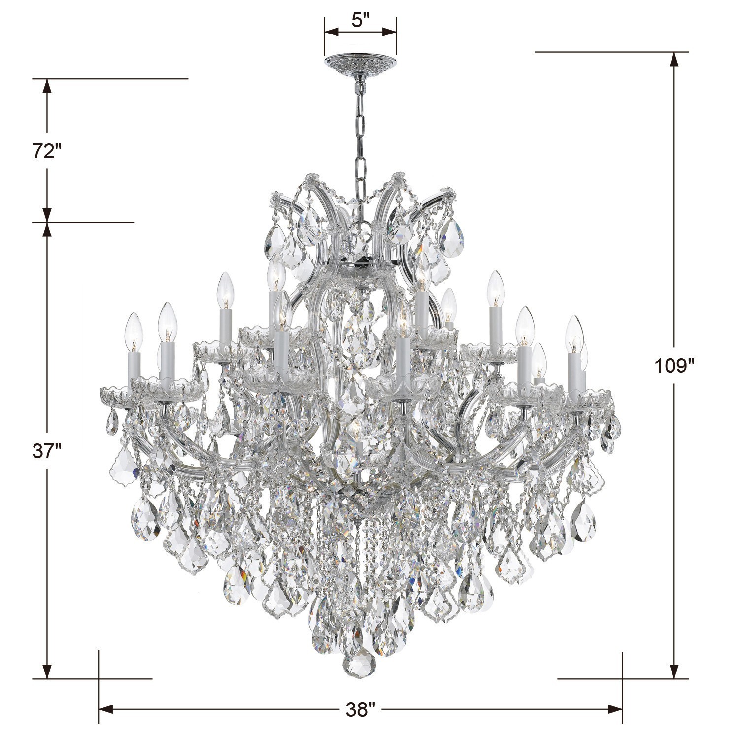 Features: Constructed from glass Decorated with clear Italian crystals Can be installed on vaulted ceilings Comes with 72" hanging chain Requires (19) candelabra (E12) 40 watt bulbs Capable of being dimmed Recommended for use with Vintage Edison style bulbs CSA and UL for dry locations Title 20 compliant Covered by Crystorama Lighting Group's 1 year manufacturer warranty Dimensions: Height: 37" Maximum Height: 109-1/2" Width: 38" Depth: 38" Product Weight: 70 lbs Wire Length: 120" Chain Length: 72" Canopy Height: 1-5/8" Canopy Width: 6" Electrical Specifications: Max Wattage: 760 watts Number of Bulbs: 19 Watts Per Bulb: 40 watts Bulb Base: Candelabra (E12) Voltage: 120 volts Bulbs Included:Yes Light color:Warm white Payment About us Return and feedback Delivery time Pay attention Payment International Buyers – Please Note: a) Import duties, taxes and charges are not included in the item price or shipping charges. These charges are the buyer's responsibility. b) Please check with your country's customs office to determine what these additional costs will be prior to bidding/buying. About us We are pleased to offer the most up to date items at competitive prices. You can rely on us to deliver the most on demand products within short timescales. Return and feedback We hope you love our product but if for any reason you want to return it or you’re not fully satisfied with your new product, please contact only Via eBay Message ,please Do not open case or return or left negative and neutral feedback,we can solve it happily by messaging. Delivery time 1.Items will be shipped to buyer's eBay registered address. Please confirm your eBay address before you make the payment. We don't accept to revise address after you make an order. 2.Items location is in China, due to geographical distance, please be advised that the international shipping usually take longer than domestic. Pay attention 1.please make sure you write correct address,we are not able to revise address after you make an order. 2.item maybe come with several packages,please message us if you only get part of them or something missing. 3.if there has accident,please do not open return or item not received case or left negative and neutral feedback before you contact only Via eBay Message ,we are glad to offer reasonable solution.