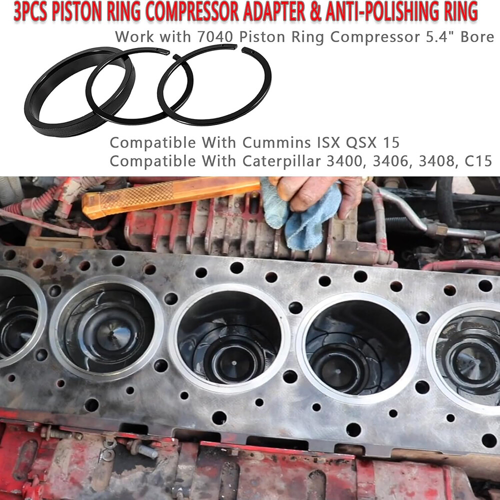 Featu res APPLICATION -- Compatible With Cummins ISX QSX 15 & Caterpillar 3400, 3406, 3408, C15. Work with 7040 Piston Ring Compressor 5.4" Bore. REPLACE OEM -- Replace 5299339, 5299447 & 5299448. Piston Ring Compressor Adapter Alternative to 5299339. Anti-Polishing Ring Alternative to 5299448, 5299447. FUNCTION -- This Adapter Kit is required to install the piston, piston ring,and connecting rod assembly into an anti-polishing ring cylinder liner. Used in conjunction with an existing 7040 piston ring compressor to install piston rings into antipolishing cylinder liners. TOP QUALITY -- Manufactured from Strong Cast Steel. Powder-Coated to ensure Corrosion-Resistant. Using top of the line machining and measuring equipment to ensure each part is manufactured to OEM quality standards and specifications. For CATERPILLAR 3400, 3406, 3408, C15 & CUMMINS ISX QSX 15 -- 5.4" Bore Piston Ring. Piston Ring Compressor Adapter Alternative to 5299339. Anti-Polishing Ring Alternative to 5299448, 5299447. Used in conjunction with an existing piston ring compressor to install piston rings into antipolishing cylinder liners. How To Install Piston For Cummins ISX ? On Oct 18, 2024 at 02:56:34 PDT, seller added the following information: On Oct 19, 2024 at 01:36:42 PDT, seller added the following information: On Oct 22, 2024 at 03:53:26 PDT, seller added the following information: On Oct 22, 2024 at 23:18:45 PDT, seller added the following information: On Nov 8, 2024 at 22:52:42 PST, seller added the following information: On Nov 15, 2024 at 19:39:06 PST, seller added the following information: