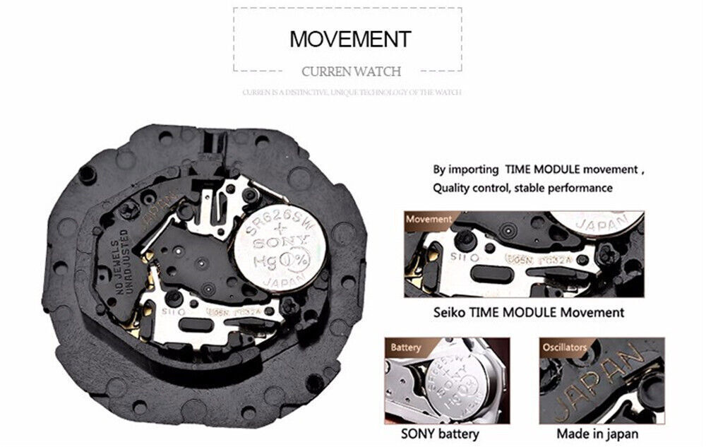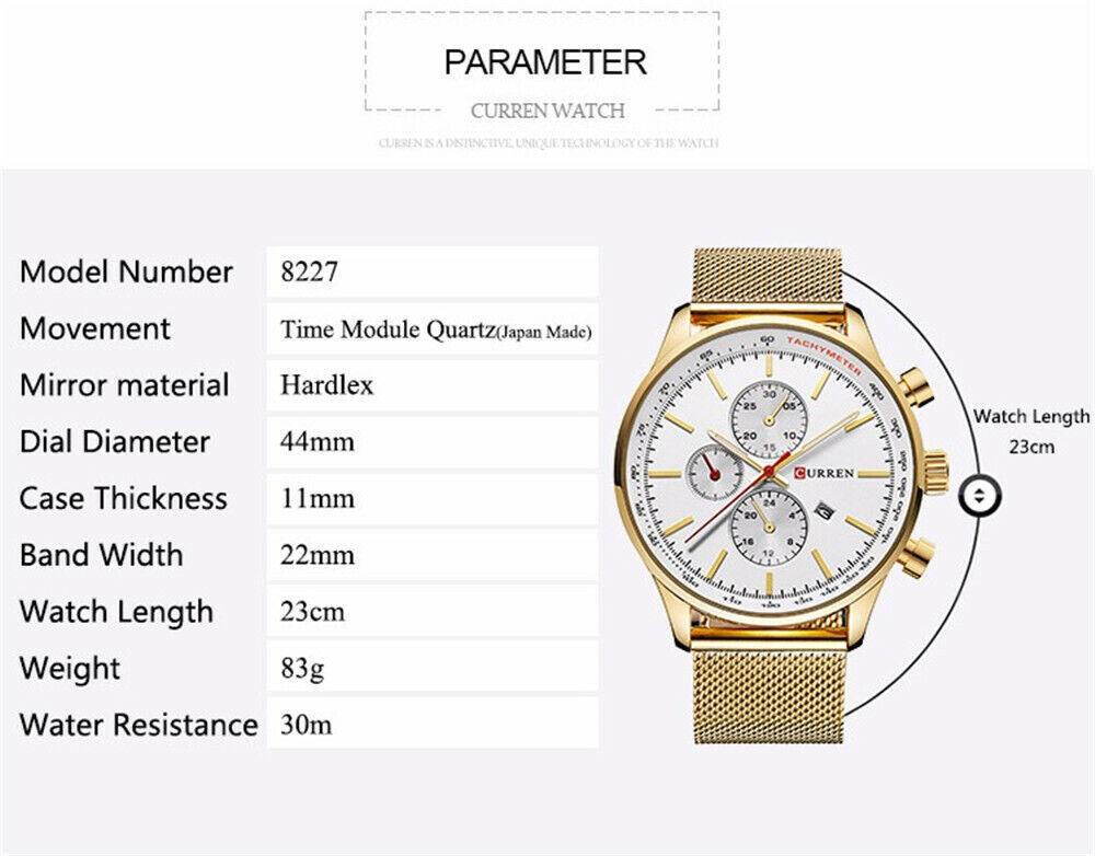 Description: Movement: Quartz Band Length: 23 cm Dial Diameter: 44 mm Band Width: 22 mm Case Thickness: 11 mm Kindly Note: The 3 small sub dials and two small buttons are just decorative, without functions. Package Included: - 1 x Watch