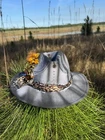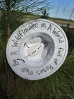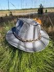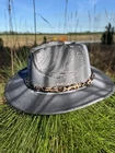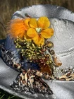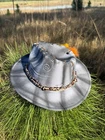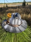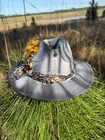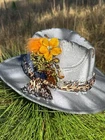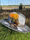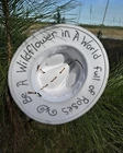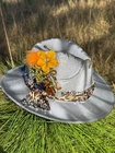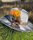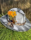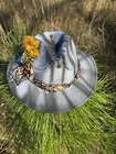 This hat is a Tazzle’s 1 of 1 custom original piece- the Band is silky Cheetah print cloth and the embellishments are wild flowers with a clear acrylic crystal heart gem. Underside reads “ In a World Full of Roses be a Wildflower” -Inner band adjusts to size. One size fits most.