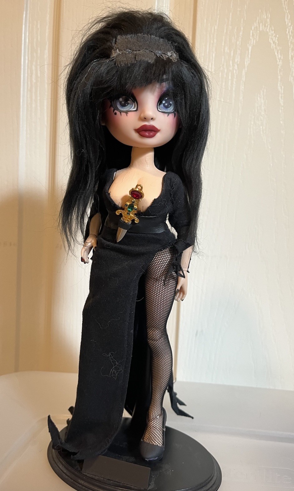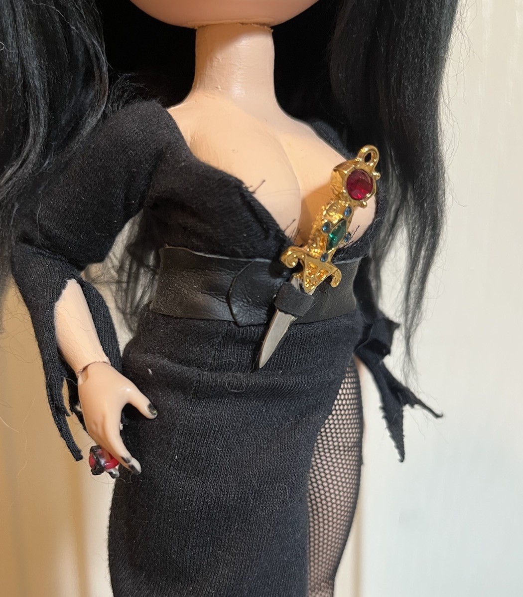 Hello! This is my only Elvira custom doll I have, her skin is painted, her ring is also an ever after high ring on her pinky, custom breasts and hand panted face makeup.