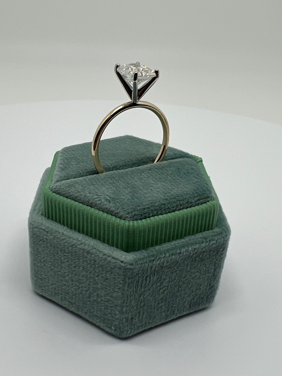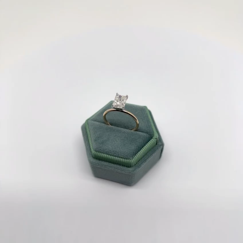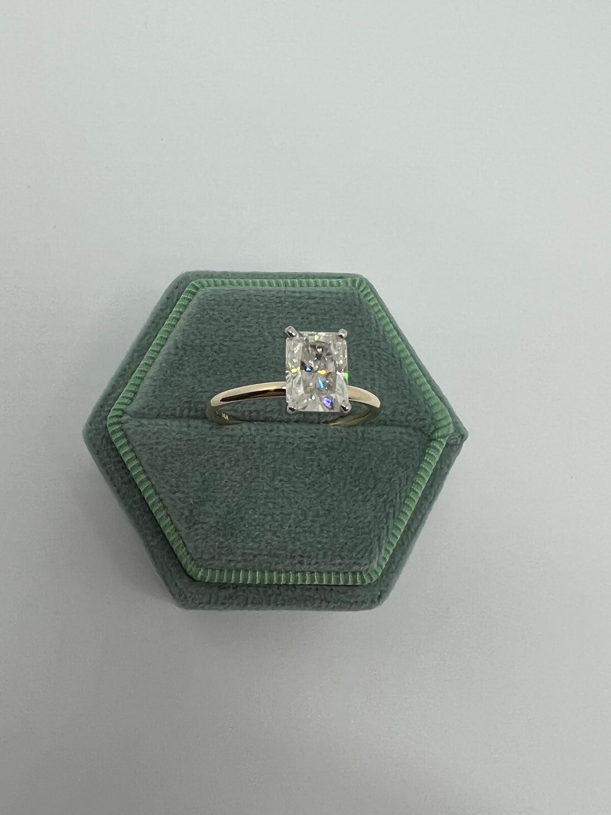 Absolutely gorgeous engagement ring with the accent on 2 - Carat Diamond and minimalistic shank. ENGAGEMENT RING Handmade item Material: Gold Gemstone: Moissanite Gem color: White Band color: Yellow Gold Made to Order 💍 CENTER/MAIN GEMSTONE SPECIFICATION Shape: Radiant cut Carat Weight: 2 Carat Color Grade: E Clarity Grade: VS1 Quantity: 1 💍 RING SPECIFICATION Metal Weight: 2.3 gram Gold Purity: 14K Shank Color: Yellow Gold Gem width: 6mm Gem length: 8mm