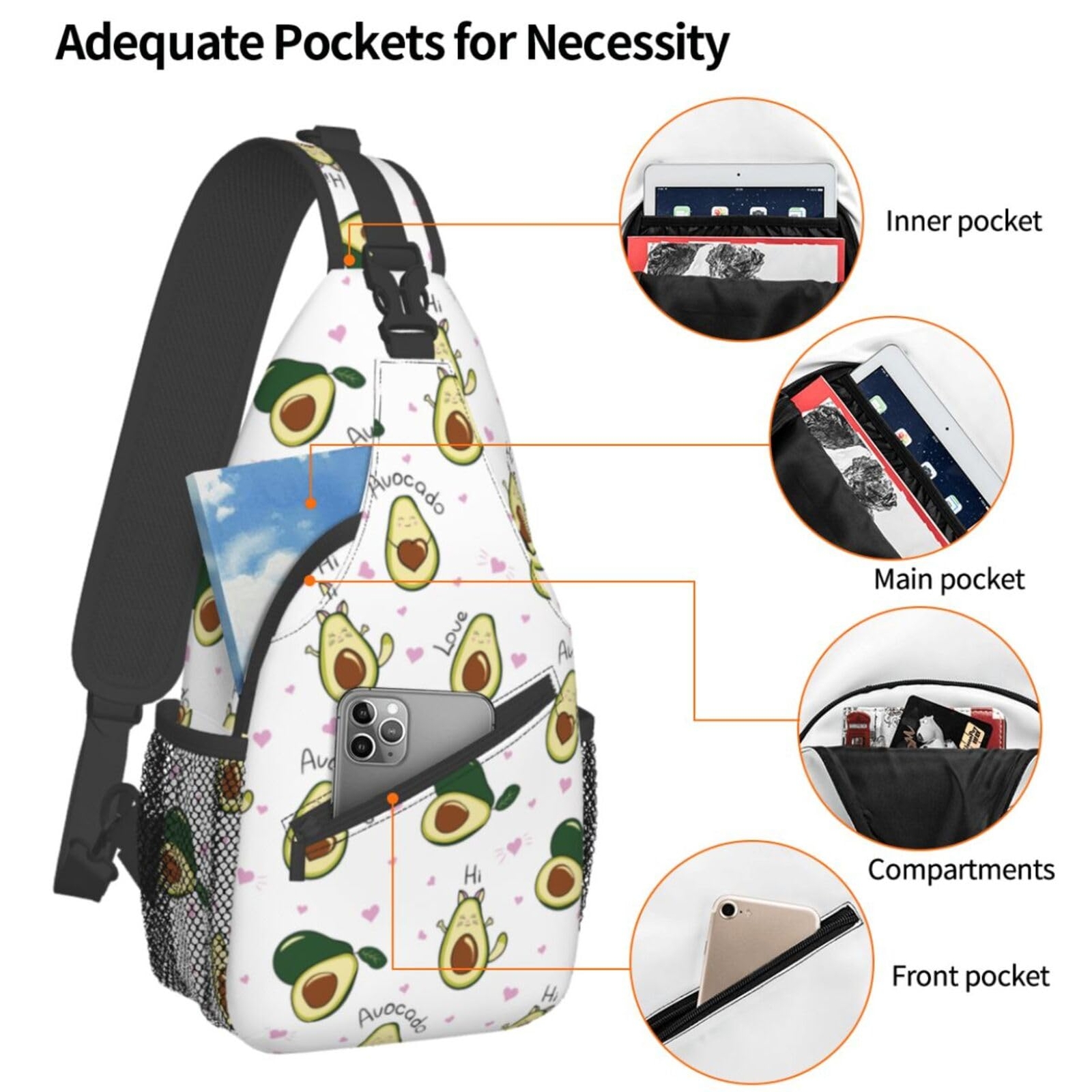 Crossbody Bags For Women Men Cute Avocado Sling Backpack Chest Shoulder Bag Gym Cycling Travel Hiking Daypack Description and features 【Small Size, Large Capacity】15.3 X 7.2 X 3.5 Inches (L X W X H). Larger Zippered Compartment For Ipad, Books, Clothes, Cameras, Etc. Smaller Zippered One For Little Items Like As Phones, Makeup, Wallets, Tissues, Keys, And So On. 2 Mesh Pockets On The Side For Umbrellas Or Water Cups. Multi-Functional Storage Area, Accessory Compartment With Functional Pockets To Keep Your Books, Mouse,Papers, And So On. 【Multi Occasion】Fits Office, Outdoor, Business, And Other Occasions. Can Be Used As Messenger Bag, Shoulder Bag, Chest Bag, Crossbody Backpack, Sling Bag, Casual Daypack, Travel Bag, Or Business Bag. Wear This Sling Bag Comfortably Over Either Shoulder Or Across The Chest To Deter Thieves And Keep Your Hands Free. 【Adjustable Shoulder Strap】Flexible Satchel Shoulder Strap Ranges From 20 To 40 Inches And May Be Adjusted To Be Loose Or Tight. Crossbody Bag Fits Your Body Perfectly. Everyday Sling Bag Is Convenient To Wear On Your Left Or Right Shoulder Because It Is Designed With One Right / Left Easily Switchable And Adjustable Padded Strap. 【High Quality Material】High-Quality Polyester Composite Cloth With Good Wrinkle Resistance And Durability Makes Up The Sling Bag For Men Women. In The Meantime, The Lightweight And Incredibly Comfortable Breathable Padded Shoulder Strap And Back Panel Will Release Heat Rather Than Retain It. 【Funny Pattern Prints】We Have A Variety Of Patterns To Choose From;No Matter What Your Taste Is, You Will Find Matching Colors And Patterns In My Shop. Description Sling Backpackperfect For Hiking, Cycling, Biking, Walking, Running, Camping, Climbing Unique And Stylish Design, Practical And Durable, Unmatched Value For Money. Return Policy ⦿ All our products come with a 30-Day Return Policy. If you would like to return your item and you are within 30 days of the purchase, and it is still in its original condition, you can return the item by contacting us through eBay messaging. ⦿ If you are not 100% satisfied, please let us know the Detailed Problem,We will give you a 100% satisfactory solution ⦿ If you received an incorrect, damaged, defective, or item not as described, contact us for a partial/full refund or replacement on our cost. ⦿ Free Shipping and Free Return 30-Days Money Back Guarantee. ☎ For all returned products, buyers MUST contact us for the returning address. Shipping ⦿ We do not ship to a different address. we will ship to the address you provide on the ebay only. Please check your address before purchase. ⦿ It should take 2-4 business days for the product to reach your destination. ⦿ If the product doesn't reach your destination within the time limit, please give it an additional 1-2 business days in case of postal delays and/or possible technical issues. ⦿ We use a selection of shipping services such as UPS, FedEx, USPS etc. ⦿ We ship only to the 48 contiguous states of America. We do not ship to Hawaii, Alaska, US Protectorates, APO/FPO addresses. Local pickups are not offered. ☎ If it takes any longer than that, please do not hesitate to contact us to resolve the issues. Contact us ☎ Please contact us via eBay message. And your message will be replied within 1 business days. For any queries, please feel free to contact us, we will get back to you as quickly as possible. Customer 100% satisfaction is our first priority and goal. We are always working hard for maintain high standards of excellence and resolve your problem in best way. So your POSITIVE FEEDBACK is very important. If you have any problem of the item, please feel free to let us know before leaving your feedback. We will try our best to solve your problem. About us We are here to give you quality products, competitive pricing and amazing service in order to make sure you get the best deal online, Thank you for your business and the opportunity to serve you.