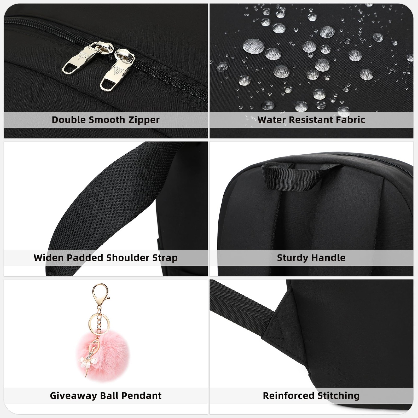 【Large Size & Gift】: The size of back pack is 17.8"x12.5"x7.5"(H*L*W), Weight:1.65 LB. The laptops bag with padded compartment sleeve fit for 13.3,14,16 inch tablet. This women book bag also along with fluffy ball key pendant as gift makes the bags more fashionable and unique 【Waterproof Material &Smooth Zipper】: The middle high school campus backpack is made of waterproof, ultra-lightweight, high density nylon fabric and cute printing polyester lining. The metal zippers closure are used by the premium quality zippers to ensure the long-lasting usage 【Convenient & Comfortable 】: The considerate belt on the both side can create a solid base of support if you’re packing a lot of stuffs on the knapsack. The Widen and thicken durable S-shape straps is well-padded, adjustable and comfortable to carry. The luggage belt on the back of bagsack can be fitted on luggage/suitcase to make your travel more convenience. 【Multi-compartments & Large Capacity 】: The travel backpack for women has 7 separate different compartments and two side elastic pockets. The main compartment of includes laptop padded sleeve with elastic belt. The front tool compartment also come with multiple pockets to provide roomy space for necessities . The back zipper pocket can protect your important items from theft. 【For Any Ages & Occasion】 The lightweight backpacking purse is stylish enough for casual and student use, while the design provides the multi functionality. Backpack perfect for young teens, girls, ladies. The basic multipurpose daypacks for most of your needs, easy to match your cloths, suitable for short trip, travelling,work, shopping, university, elementary school, etc