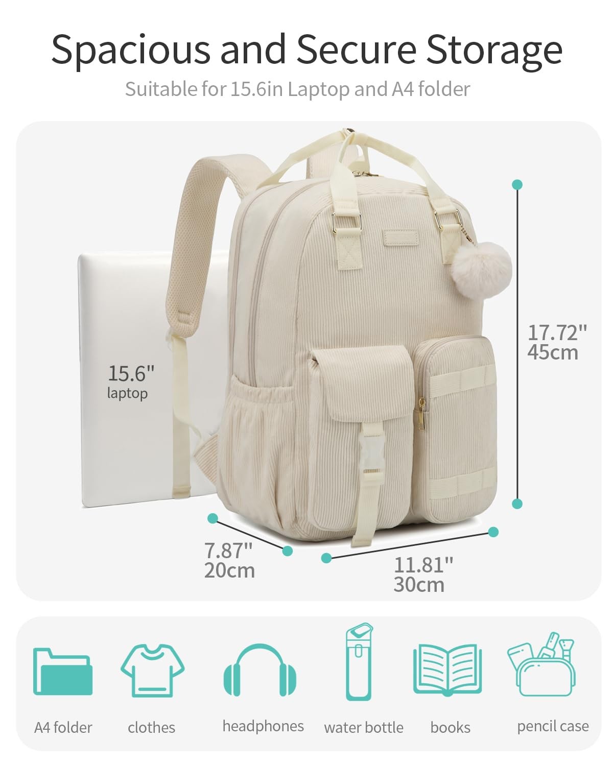 Child school backpack: Simple & convenient design, independent 15.6"/17.3" laptop sleeve, 1 huge main compartment for A4 folders, books and lunch box, middle pocket with organizer, 2 front utility pockets, 2 side pockets and a back anti-theft pocket. Whether your carrying textbooks, tech gadgets, or travel essentials everything has its place within this versatile pack. A Lots of Useful Pockets: Simple & convenient design, independent 15.6"/17.3" laptop sleeve, 1 huge main compartment for A4 folders, books and lunch box, middle pocket with organizer, 2 front utility pockets, 2 side pockets and a back anti-theft pocket. Whether your carrying textbooks, tech gadgets, or travel essentials everything has its place within this versatile pack. Lightweight but Durable: backpack are made with durable corduroy, lining, zippers & straps in colors & designs. The perfect blend of style, durability, and light design for school, playdates, or family outings. Comfortable Even After All-Day Use: Equipped with adjustable, S-curve padded shoulder straps, our backpacks minimize strain on your back, making them easy and comfortable to carry throughout the day. With a luggage strap that can free up the shoulders when you are traveling. Travel Friendly: With TSA laptop compartment get you through airport security checkpoints quickly and easy to access your laptop during travel. With charging hole makes it easy to charge your phone while walking or riding. Top handle provides you with multiple carrying options. Both side pockets have elastic closures for larger water bottles. Gifts for School Year: Featuring a practical silhouette and cute accessories that always looks amazing. It is a Eye-catching backpack. Ideal for elementary, middle, high, and college students.