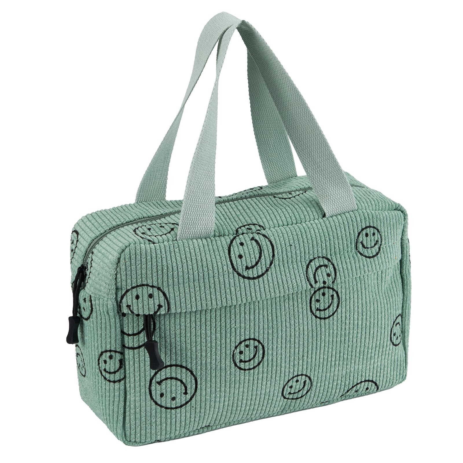 Women Cosmetic Bag Large Makeup Bags Cute Corduroy Cosmetic Pouch Portable Makeup Organizer Travel Toiletry Bag Product Details Color: 2-Green Smile Brand: ZOEMTIU MPN: ZOEMTIU-ZUS2 UPC: Does not apply EAN: Does not apply Package Dimensions : 11.46 x 8.15 x 2.17 inches; 4.97 ounces Manufacturer : ZOEMTIU Country of Origin : China Spacious Cosmetic bag-The large women Wash Bag(11.81in 7.87in 3.93in)with 3 inner compartments organises easily your beauty essentials or small purses, and hold enough Beauty-Proudcts ,Body-Proudcts ,which be used as makeup storage bag for travel,essentials,toiletries Portable Smiley makeup bag -The cute hanging Toiletry Bag for women is convenience when Travelling-can holds a lot of makeup products,daily necessities ,also padded with the bottom to increase the good stability and also prevent bumps Fashionable Toiletry bag- This cute women's Cosmetic bag is made of lightweight corduroy,it is small but generous and Smiley pattern design-functional, can be used as toiletry bag, travel storage Handbag, cosmetic Pouch,suitable for Travelling, Holiday Gift-It is more cute and practical gift -portable, lightweight, which makes it good choice for travel, Weekend,It is machine washable as a wash bag, neither rough nor the colour fades, it is also a very nice gift for women Purchase Carefree: If you have any Questions or dissatisfaction with the Product, please feel free to contact us, we would give you a satisfied Answer as soon as Possible