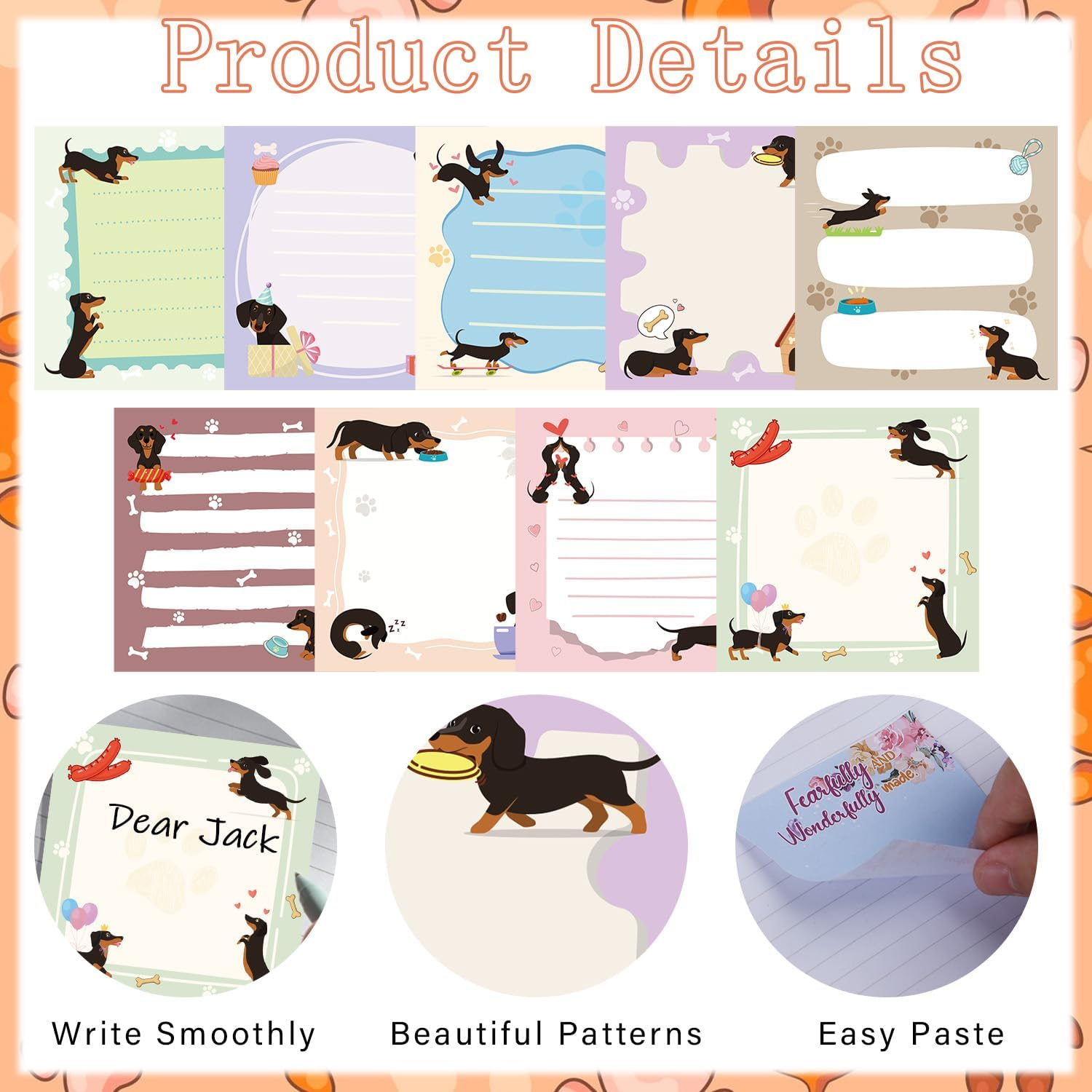 What You'll Get: You will receive a set of cute dachshund themed sticky notes. The dachshund sticky notes set includes 9 packs of 3*3 inch funny wiener dog sticky notes, 50 sheets per pack, 450 sheets in total. Dachshund self-adhesive sticky notes are very cute and practical, perfect for use at work, school and daily life. High Quality Material: The cute dachshund sticky notes are made of high quality paper material, the surface is smooth and not rough, you can use different kinds of pens to write. The paper and glue of the dachshund sticky notes are carefully treated to keep them sticky for a long time, perfect for use. Size and Design: Cartoon dachshund sticky notes set measures 3.0*3.0 inches, about 7.62*7.62 cm, medium size, easy to carry around, the dachshund notes pads set is made of fun dachshund pattern with colourful patterns, giving a vivid and interesting feeling, and it can meet your daily use needs. Paste on Multiple Items: The adhesive backing of the dachshund sticky notes has a good adhesive backing, which can be easily stuck to paper, desktop, laptop, notebook, whiteboard, walls, fridge, desk, cups and other places. The dachshund sticky notes will not leave a mark when you tear them off, very convenient to change the location or throw them away at any time. Widely Applicable: Dachshund sticky note set is versatile and perfect for use in office, school, home, for matter reminders, notes and memos, time management and organisation sorting, daily reminders, to-do lists and more. In addition, the dachshund self-stick note pad is also a fun dachshund gift for dachshund lovers, friends, family, co-workers and more. Product Description