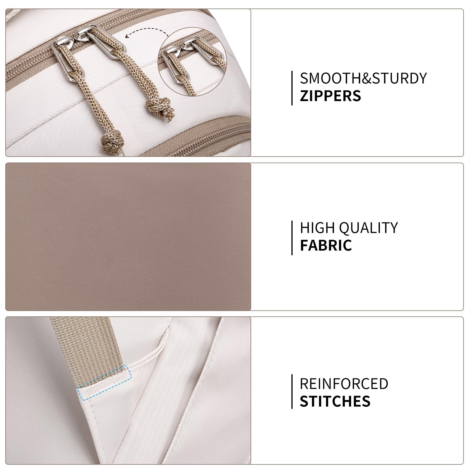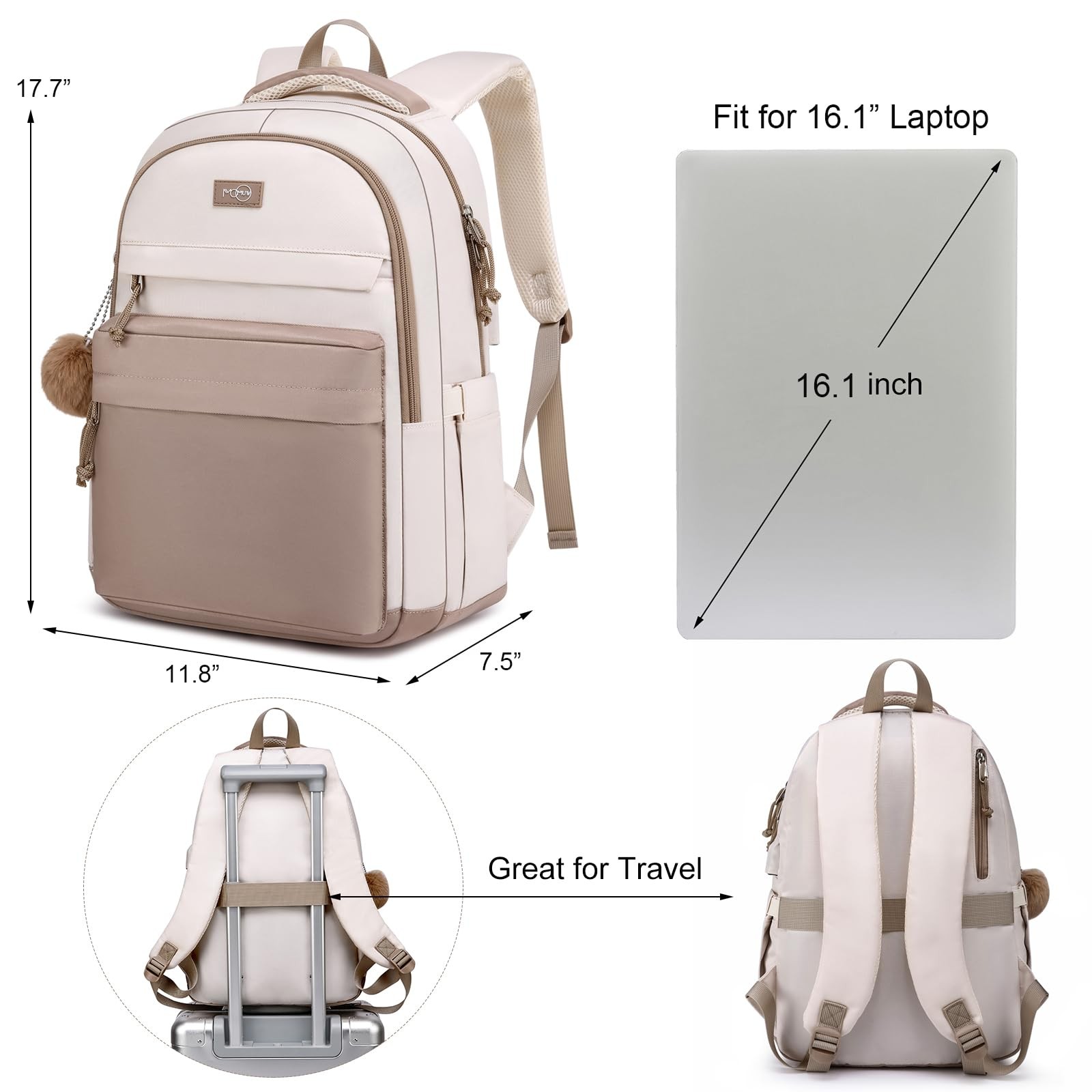CAPACITY AND POCKETS:17.3 x 11.7 x 7.5 inch,25L.Main compartment roomy for binder,ruled paper,notebook,pencil case,subject,books,clothes,water bottle,lunchbox,other school supplies.Padded laptop compart with velcro fits 13 to 16 inch laptop.Organized compartment and Front pockets for pencil,keys,mouse, headset,ID card. USB CHARGING PORT:The school backpack comes with built in USB charger outside , built in charging cable inside, offers you a convenient way to charge your phone when you are walking, riding. WATERPROOF AND BREATHABLE:Girls schoolbag is made of water-resistant fabric,in light rain, the contents of the bookbag will not get wet.Shoulder straps have soft and breathable sponge to effectively reduce back pressure. FEATURES AND DETAILS:Featuring the trolley belt on its breathable back, business traveler could fit bookbag right on the luggage suitcase, which free your hands.Anti-theft pocket on the back is very convenient for storing keys, credit cards, cell phones and other valuables. OCCASIONS AND GIFT:The bookbag has a stylish front design.Ideal for school backpack, daily backpack, travel backpack, computer backpack, work backpack, nurse backpack, teacher backpack,etc.As a gift for her, mom, wife, daughter.