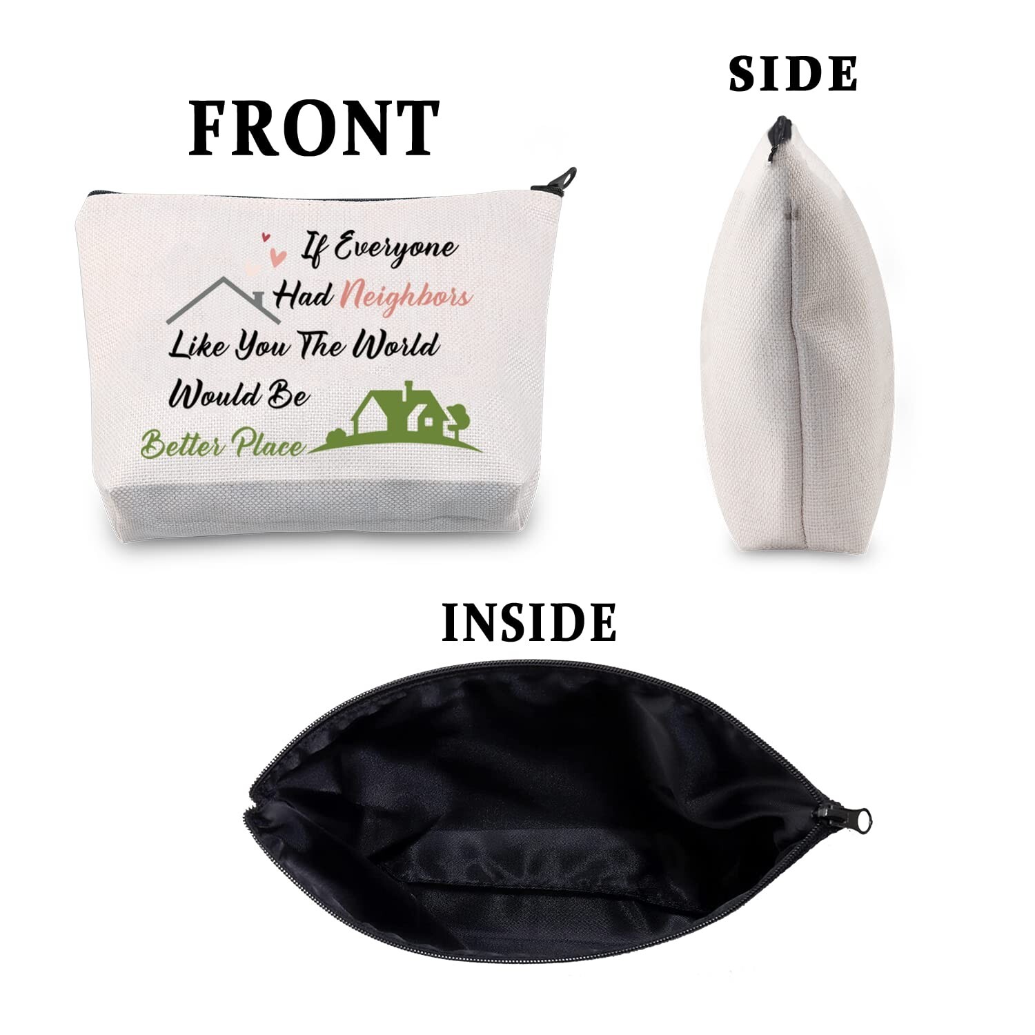 CMNIM Neighbor Gifts for Women Neighbor Makeup Bag Housewarming Gifts for New House New Neighbor Going Away Thank You Gift(Best Neighbor Makeup Bag) Product Details Color: Best Neighbor Makeup Bag Brand: CMNIM MPN: Does not apply UPC: Does not apply EAN: Does not apply Product Dimensions: 10 x 2.5 x 6.7 inches Item Weight: 1.76 ounces Department: unisex-adult Country of Origin: China MATERIAL: Made of Polyester fibre.High-Quality Cotton And Linen.Strong pouch zipper, double-sided printing, double-sided waterproof coating and awesome printing on the surface. Suitable for any occasion. MEASUREMENT: 10*6.7*2.5inches./25.4*17.01*6.35cm.Suitable for daily carrying. TIPS:manual measuring permissible error.. ENGRAVE WITH:If Everyone Had Neighbors Like You The World Would Be Better PlaceMaking a wonderful and meaningful gift to bring joy to someone's day or a simple positive pick me up treat for your family, students, friends... It is a fantastic gift for important days in one year. SUITABLE:Gifts are never limited to time, only to express the most sincere feelings. It is not a small item but a big surprise for your loved one!Suitable for any occasion such as birthday,Thanksgiving Day,Christmas Day or just because! And It is elegant enough that everybody can wear it with your casual as well as formal attire. POUCH ZIPPER:Earphones, lipstick, School supplies,, key chains and various card items can all be put in the bag. Bags with different printing can better sort out and summarize your life accessories. The lightweight cosmetic bag is not only convenient and large capacity, but also the perfect printing strengthens the style of daily wear.Gives attractive look which definitely captures your friends attention. It is elegant enough that you can wear it with your casual as well as formal attire. Features: 1. The cotton material allows for machine washing and stretching per foot offering the perfect all round size. 2. These makeup bags offer the very funny message to make them laugh. 3. These funky makeup bags are a unique funny gift for those special occasions. This time bring a gift that will stand out with a lasting effect and imagine the reactions of your loved ones. 4. Perfect for pamper days , birthdays , couples , housewarming , mothers day , hostess , housewarming gifts & valentines.