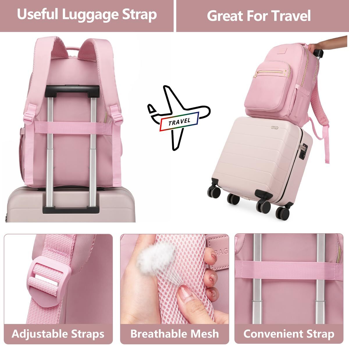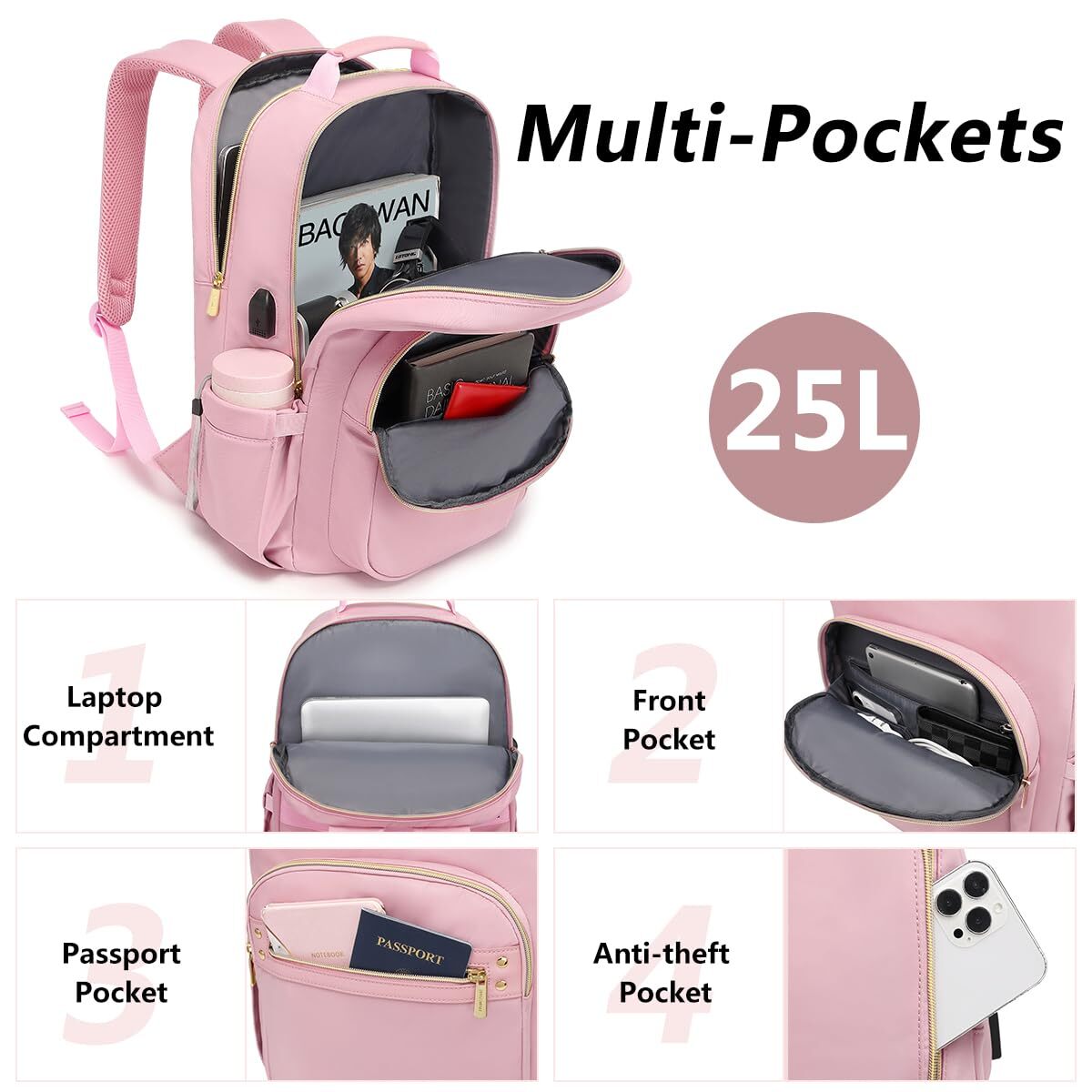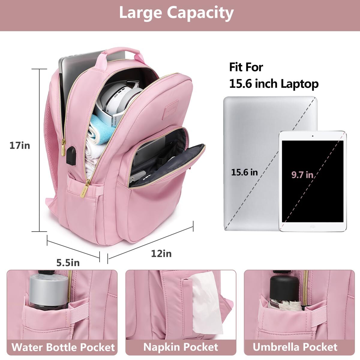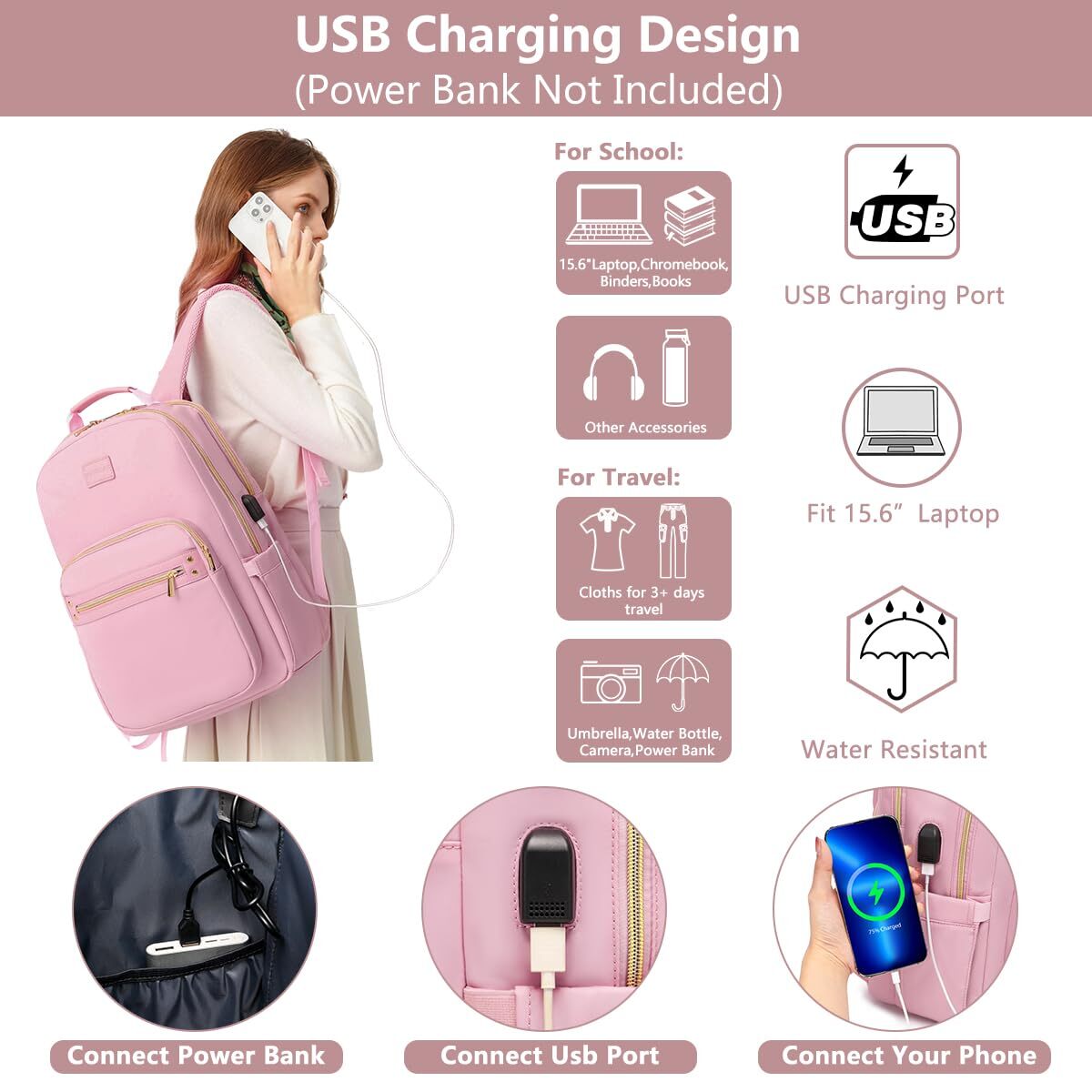 Laptop Backpack for Women Bookbag Cute Pink School Backpack for Teen Girls Nurse Bags Work Backpack Teacher Back Pack Waterproof 15.6 inch with USB Charging Port PRODUCT DESCRIPTION PRODUCT FEATURES Large Capacity & Multiple Pockets: This women backpack has 4 main compartment pockets. 1 separate laptop compartment for your 15.6 Inch computer as well as 15 Inch, 14 Inch and 13 Inch. 1 main big pocket provide multi space for your change of clothes, books, A4 folder and other school supplies etc. 2 front compartments can hold charge device and other small items. Two side pockets hold your water bottle and umbrella. Many pockets make you conveniently to organize. USB Charging Port School Backpacks: With a USB charging port extended on the side of the student bookbag and built-in a charging cable inside, it offers an easy access to charge your phone when you are on the way back to school. Please noted that this womens college backpack only offers an easy access to charge, power bank is not included. Fashion Travel Backpack with Luggage Strap: Luggage strap on back of the computer backpack allows bag fit on luggage/suitcase, freeing your hands on a business trip. Soft shoulder straps take the pressure off your shoulders. A small anti-theft pocket located on the back, keeps your phone, wallet, passport safe. No need to worry about stolen items. Make your travel more convenient and enjoyable. Multifunctional & Serviceable Backpack:This laptop backpack is made of nylon and leather, exquisite and cute, waterproof and cleans easily. Lightweight materials reduce the burden of use, appropriate for daily use. Perfect as a wrok backpack, business backpack, travel backpack, college school bookbag for women, teens, girls, nursing students, teachers etc. After-Guarantee & Nice Gifts: Our laptop backpack purse provide 12-hours of customer service, 30-days no-reason returns. women backpack can be fits for everyone and every occasion. High quality and nice stylish looking can be a gifts for your mother, friends, family on some special days Mother's Day, Birthday, Adult Valentine's Day, Christmas etc. 🚚 SHIPPING We offer fast and reliable shipping. Your order will be processed within 1-2 business days. International shipping is available to most countries. All items are securely packaged to ensure safe delivery. 🔄 RETURNS If you are not satisfied with your purchase, you can return it within 30 days for a full refund. Refunds will be processed to your original method of payment. Items must be returned in their original condition and packaging. 💳 PAYMENT We accept payment via PayPal, credit cards, and other payment methods supported by eBay. Please ensure your payment method is correct and updated to avoid any delays in processing your order. ⭐ FEEDBACK We value your feedback. If you are happy with your purchase, please leave us a positive review. 📞 CONTACT US If you have any questions or need further assistance, please feel free to contact us through eBay messages.