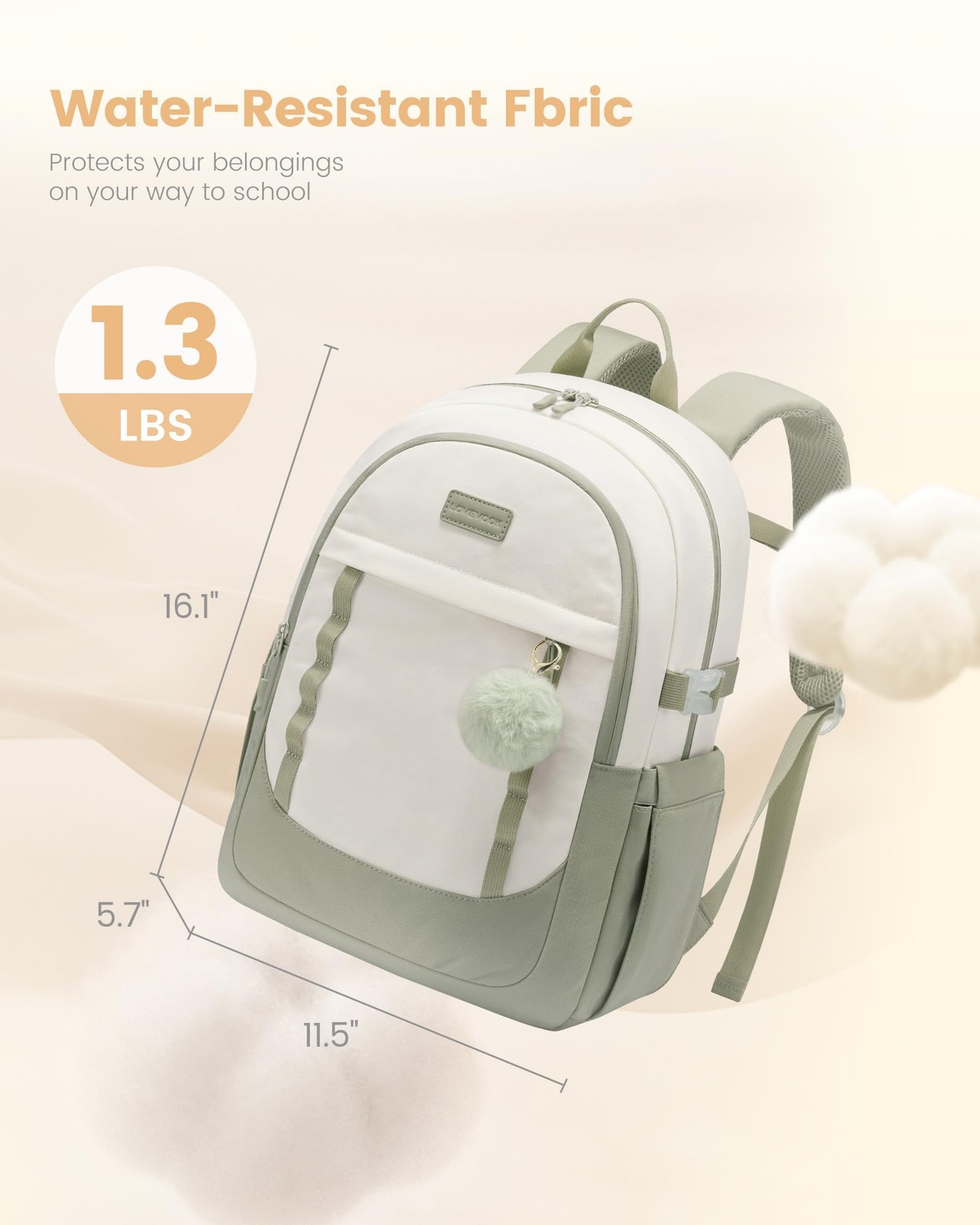 Dimensions: 11.5''(L) x 5.7''(W) x 16.1''(H) Weight: 1.3 LBS. Elevate your school style with our Cute Water-Resistant Student Backpack, uniquely designed for girls aged 6-18 who value both charm and functionality. This school backpack for girl effortlessly combines spacious storage and stylish design, making it the ideal companion for school and beyond. Boasting a generous 33L capacity, this backpack for school girls can easily store school books, notebooks, and essentials, while the dedicated laptop compartment protects your tech on the go. Ergonomically crafted shoulder straps with enhanced padding provide superior comfort, complemented by an adjustable chest buckle to ensure a secure fit. Stay refreshed throughout the day with our innovative side water bottle holder, featuring a handy buckle that can accommodate larger bottles. Plus, the teen girl backpack's delightful design is paired with fun accessories like a pom-pom and cute badges, perfect for personalizing with the front daisy chains. Constructed from high-quality, water-resistant polyester, this bookbag for teen girls is designed to endure daily adventures and withstand the elements. Additional features like the luggage strap and a hidden anti-theft pocket add practicality for students on the move. Whether she’s heading to class, traveling on a family trip, or exploring new interests, this cute backpack’s versatility and adorable style make it an excellent gift choice for birthdays, holidays, or just because. Gift her the perfect blend of fashion and functionality with our Cute Water-Resistant School Backpack. Order today and make her school days even more special! 【 33L Capacity & Smart Storage】: Featuring 12 pockets, this 33L school backpack for girls efficiently holds school essentials like books, notebooks, and a 15.6" laptop in its padded compartment, keeping everything organized and accessible for busy school days. 【Ergonomic Shoulder Straps & Chest Buckle】: This student backpack features 2.7'' wide, 0.5'' thick padded shoulder straps, along with an adjustable chest buckle for a snug fit. It ensures comfort, reducing shoulder strain for growing girls. 【Adorable Design with Fun Accessories】: The cute backpack for teen girl includes cute pom-poms and badges for DIY customization on the front daisy chains, allowing young students (ages 6-18) to express their personality and style. 【Large Cup Holder】: Featuring a dedicated side buckle holder, this bookbag for teen girls securely holds large water bottles, ensuring easy access and constant hydration for active students. 【Practical Details】: Crafted from long-lasting, water-resistant polyester, this laptop backpack features a luggage strap for suitcase attachment and a hidden back pocket for securing valuables, adding extra security and convenience. 【Versatile & Great Gift】: With its charming design and practical features, this backpack for girls is suitable for middle school, high school, college, travel, and everyday use. It makes a perfect gift for birthdays, holidays, or any special occasion for young girls.