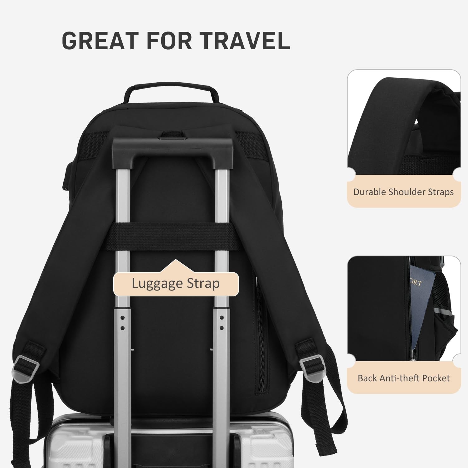 Features 1. Luggage strap can freedom your shoulder 2.Roomy main compartment with a laptop sleeve and a tablet pocket 3.The front tool compartment also comes with multiple slots to provide roomy space for necessities 4.The front 4 small zip pockets can hold your small items 5.Two elastic mesh side pockets can hold big water bottle or umbrella 6.Organize your favourite badges on the two front straps. 7.Padded thicken shoulder straps for a more comfortable carry 8.Soft padded thick back panel adds comfort 9.USB port allows you to connect your own power bank 10.Reflective strips, reflective at night or in the dark, warning passing vehicles to avoid. 【Size &Well-Organized Pockets】: The size of girl back pack is 17.7x12.8x6.7". 7 separate different compartments with many pockets and two side elastic pockets provide roomy space for back to school and daily necessities such as clothes, stationery, notebook, pens, phone charger cable, Kindle devices etc. The laptops bag is with a padded separate laptop sleeve fitting for 13.3, 14, 15.6 inch laptop and a tablet pocket. 【Water-resistant Fabric &Durable Zipper】: The middle high school campus backpack for teens girls is made of water resistant, high density fabric, effective protection for electronic devices and other items inside the bag from light rain. The metal zippers closure are used by the premium quality zippers to ensure the long-lasting usage. 【Convenient & Comfortable 】The widen and thicken durable shoulder straps is well-padded, adjustable and comfortable to carry. Unique back design with thick but soft multi-panel padding gives you more back support. The luggage belt on the back of the laptop bag can be fitted on suitcase for easier carrying. A hidden anti-theft zipper pocket on the back protects your valuables such as cell phone or wallet from theft. 【USB Charging Port & Gift & Safety】: With external USB interface and built in charging cable inside, this USB backpack offers you a more convenient way to charge your phone while walking. This women bookbag also comes along with a fluffy ball key pendant as a gift, which makes the bags more cute and aesthetic. Also reflective strips on both sides can warn passing vehicles to avoid when you at night or in the dark. 【For Any Ages & Occasion】 The cute backpacking purse is stylish enough for casual and student use, while the design provides the multi functionality. Backpack perfect for young teens, girls, ladies, women, suitable for short trip, travelling,work, shopping, university, high school, elementary school, etc.