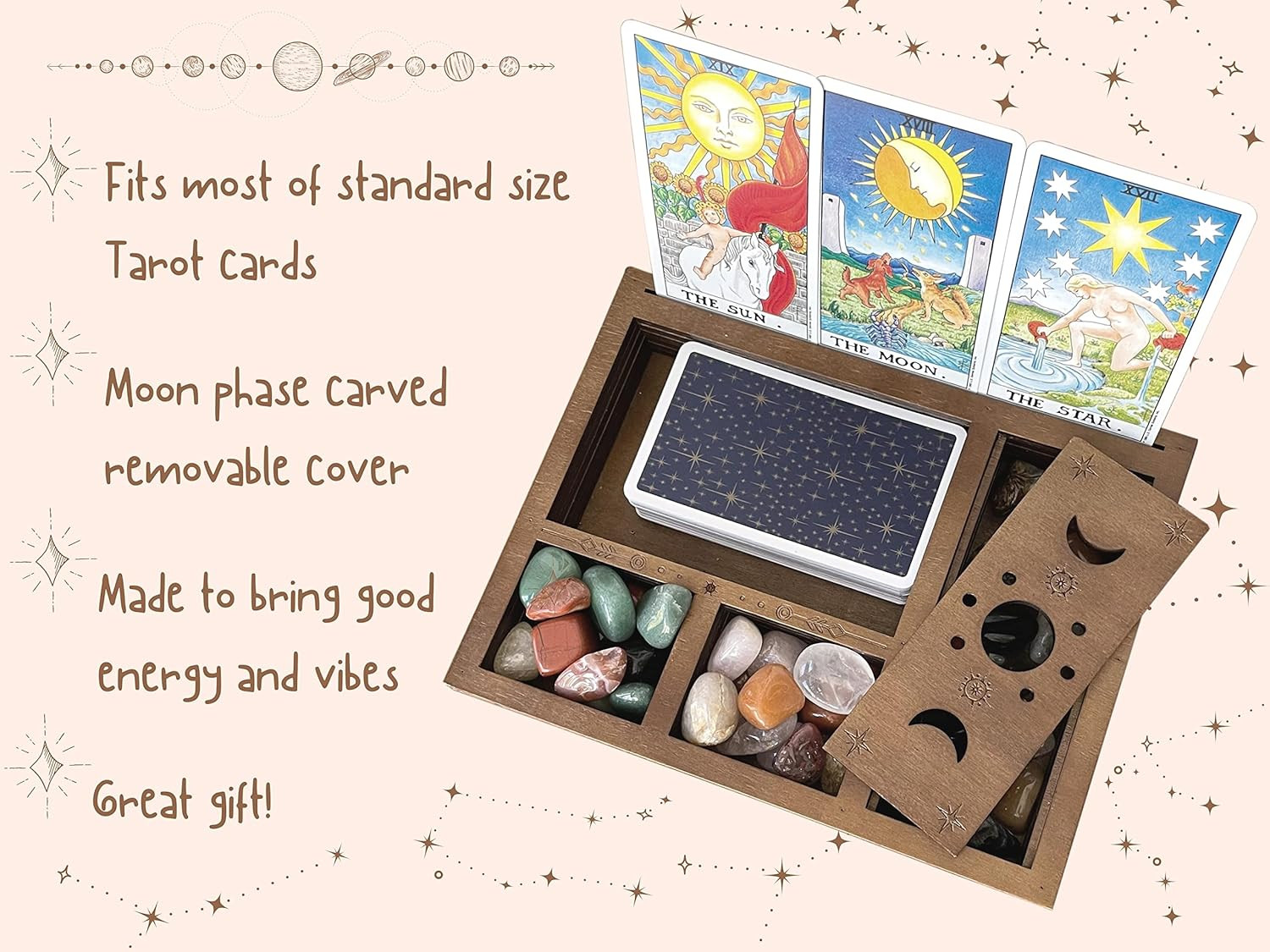 Tarot Card Holder Stand Display, Cute Witchy Desk Decor, Decorative Box Wood Product Details Base Type: Pedestal Assembly Required: No Number of Levels: 1 Special Feature: Lightweight,Portable Manufacturer: Lava Land Product Dimensions: 9.5 x 7.5 x 1.5 inches Item Weight: 14.4 ounces Country of Origin: China Item model number: TCH-01 Batteries required: No Color: Wood Material: Wood Brand: Lava Land Item dimensions L x W x H: 9.5 x 7.5 x 1.5 inches Shape: rectangular prism DISPLAY TAROT CARDS - As practical as it is functional, our tarot card holder stand is ready to display your tarot cards or daily affirmation cards by keeping them in place and secure LIGHTWEIGHT, PORTABLE, BUILT TO LAST - Compact and easy to move from room to room in your house, dorm, or office space. Lightweight and portable, our aesthetic boho wooden box is designed for those who collect and read cards on the go, or need a safe place to store their altar supplies crystals and accessories. UNIQUE BOHO DESIGN – Beautiful dark wooden box featuring intricate celestial moon phases designs and compartments that compliment any desk, stand, or room you place it in, creating the ultimate witchy room décor aesthetic. VERSATILE STORAGE BOX – Our box is designed to hold all your favorite tarot accessories. Use to hold all your favorite Pagan Wiccan altar supplies, or as a crystal display tray holder storage box for stones organizer. PERFECT GIFT FOR THE TAROT ENTHUSIAST IN YOUR LIFE - There’s no better gift this spooky season than our tarot card holder stand. There is no better way to achieve the boho, spiritual, witchy room décor aesthetic of your dreams than with our wooden tarot card holder stand. Use it to display your tarot cards, crystals, or whatever pagan wiccan altar supplies you desire. Our tarot card holder stand has a beautiful storage and card display that’ll be a perfect addition to any room décor aesthetic. The simple and elegant design allows this masterpiece to blend in with all styles of witchy desk and room décor. Take advantage of the multiple compartments that can be used to store your tarot accessories, altar supplies, and jewelry. Turn it into a crystal holder storage box for stones organizer if you desire. The possibilities are endless. This is a memorable and meaningful gift for those seeking to create the cute witchy room décor aesthetic of their dreams.