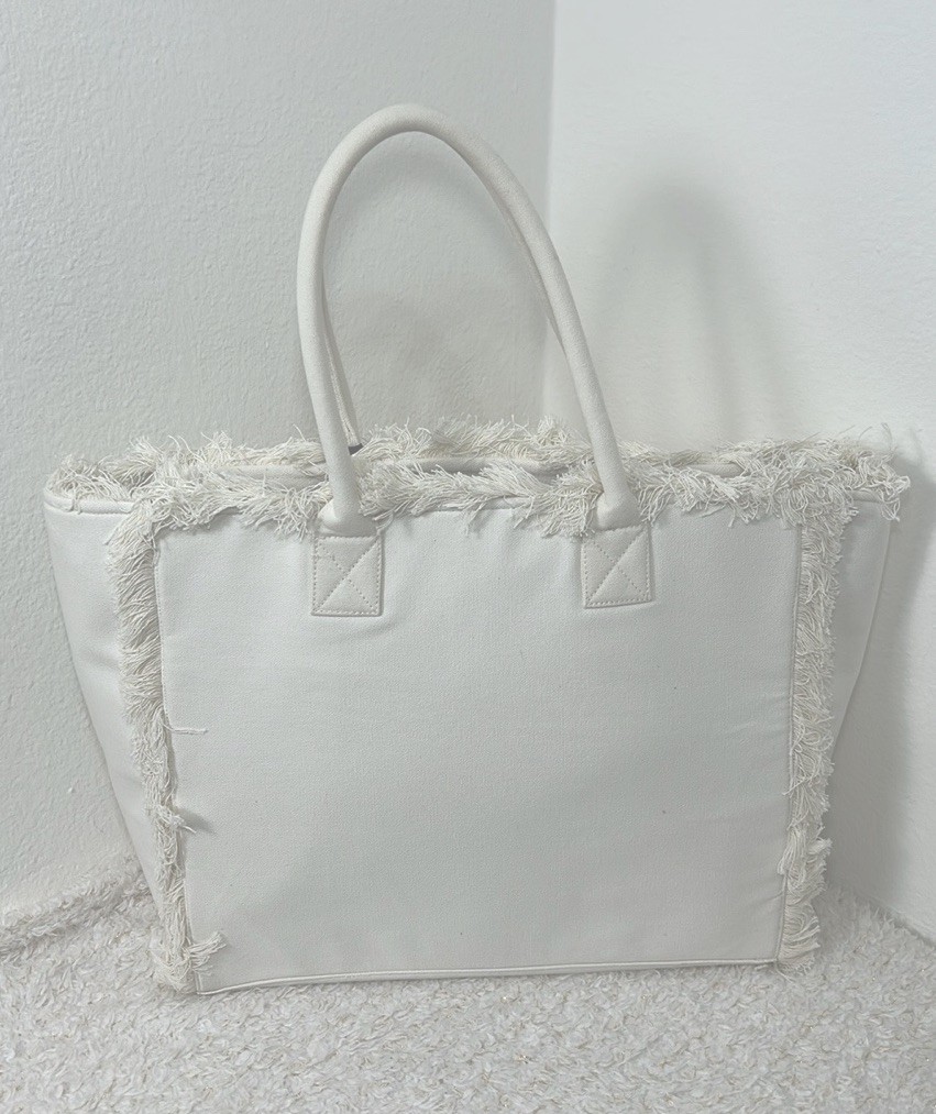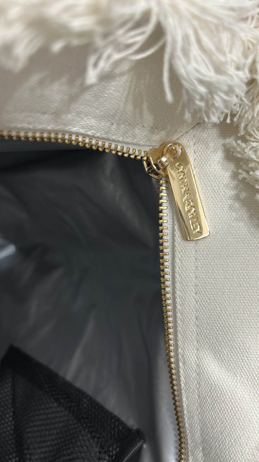 The Cynthia Rowley Summer Bag is a large rectangular tote bag made from canvas and cotton in a solid white exterior color with a matte finish. It features a zip closure, gold hardware accents, and white handles/straps. The bag has a lemon character and is designed for summer use, with inner pockets and insulated features for added convenience. With its stylish design and practical functionality, this bag is perfect for women on the go during the warmer months.