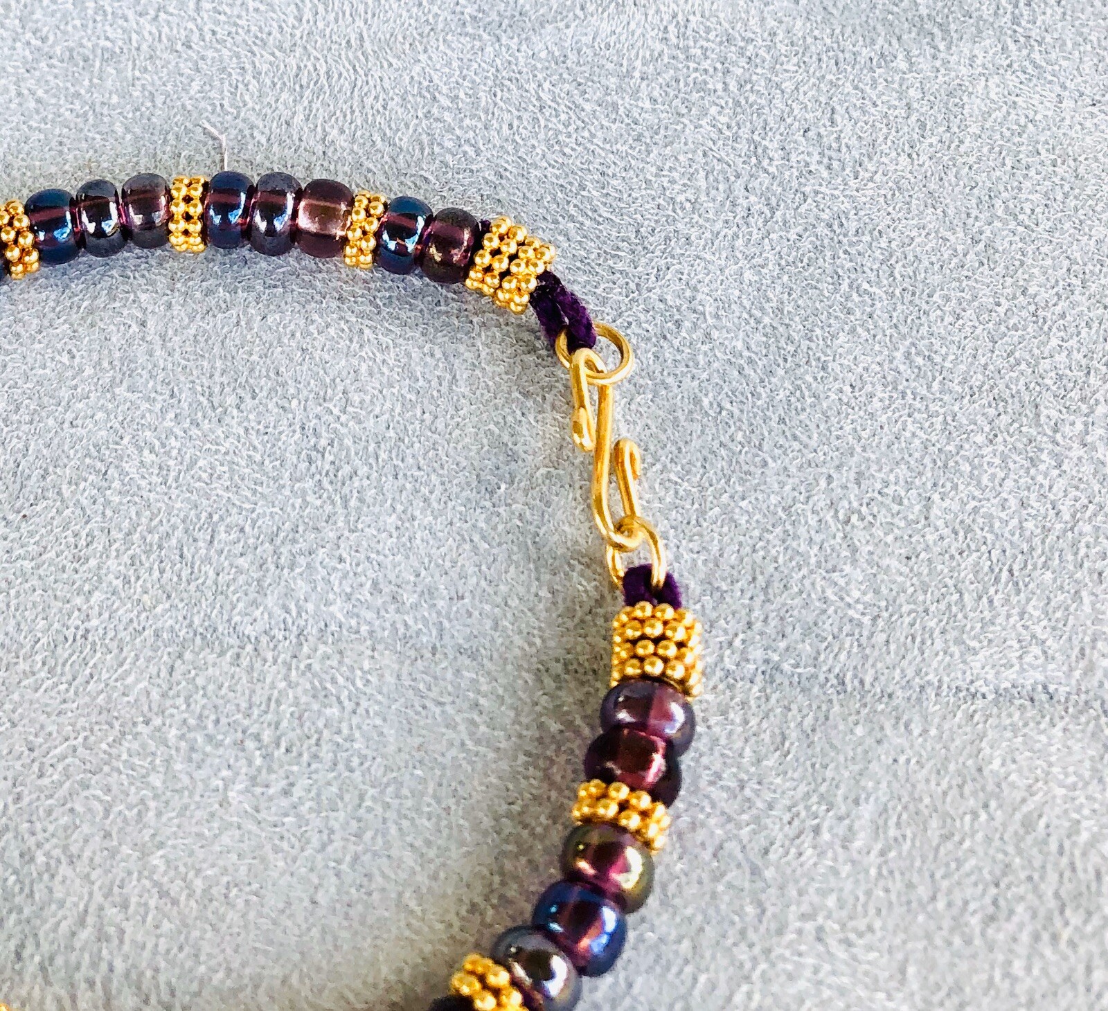 Bracelet Czech Fire-polished Plum-colored Rondels enhanced by Vermeil Daisy Spacers. Elegant and wearable day or evening. Size 7-3/4”.