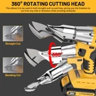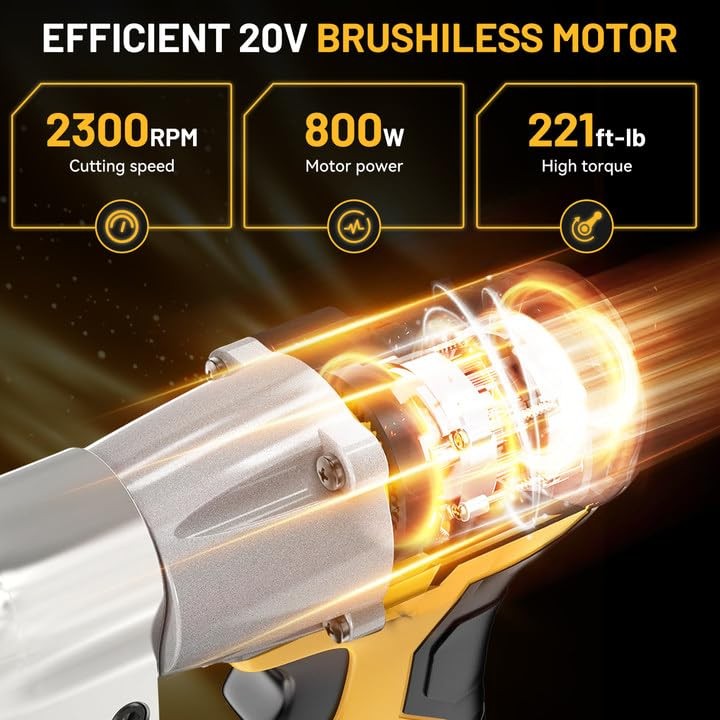 Cordless sheet metal cutter compatible with DE-WALT 20V Max batteries (tool only), featuring a 2300RPM brushless motor, 221 Ft-Lbs max torque, and a 360° rotating head for precise cutting of stainless steel, sheet metal, and iron (up to 20-gauge/18-gauge). Includes safety lock and forward/reverse functions for control and efficiency. Kindly Reminder: This cordless metal shear does NOT INCLUDE any batteries, bare tool only Cordless and Battery Compatible: This cordless sheet metal cutter is designed for use with DE-WALT 20V Max batteries (battery not included), including models DCB200, DCB201, DCB203, DCB204, DCB205, and DCB206. Leverage your existing DEWALT battery for efficient and reliable cutting Superior Cutting Performance: Achieve high-precision cuts with a maximum torque of 221 Ft-Lbs, capable of cutting up to 20-gauge stainless steel and 18-gauge sheet metal. This electric metal shear is built to handle a variety of materials with ease, providing excellent results for professionals Brushless Motor for Maximum Power: Equipped with a 2300RPM brushless motor, providing up to 800W of power. This Metal Scissors ensures smooth, high-efficiency cutting for both professional users and DIY enthusiasts, enhancing performance on tough materials 360° Pivoting Head for Flexibility: The 360-degree pivoting head provides flexibility, making it easy to cut from any angle. Whether you need to make straight lines, curves, or irregular shapes, this metal scissors design adapts to your needs for precise cutting Safety Lock and Ergonomic Design: Designed with a safety lock and forward/reverse functions, this brushless cutter tool ensures user safety and control. Its ergonomic handle and intuitive controls make for a comfortable and secure cutting experience, even during extended use